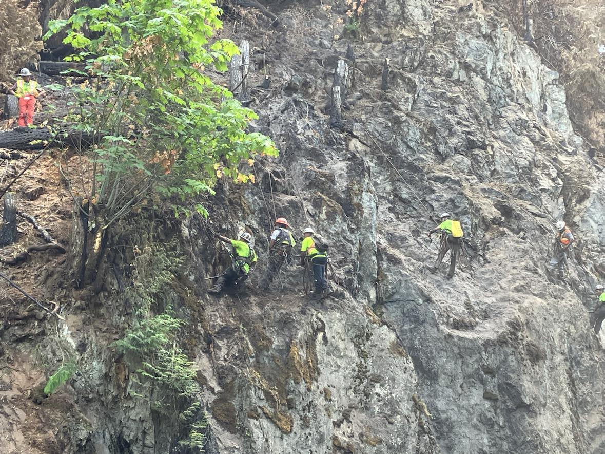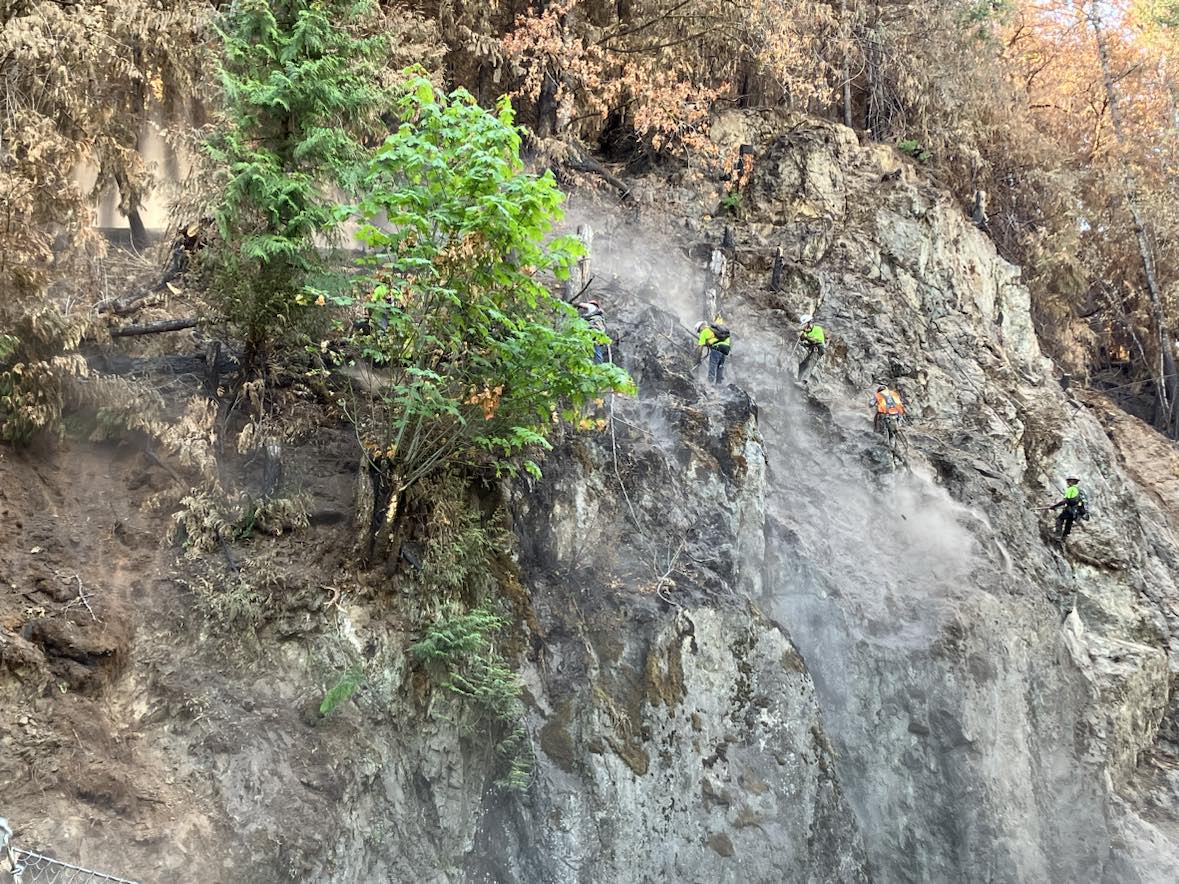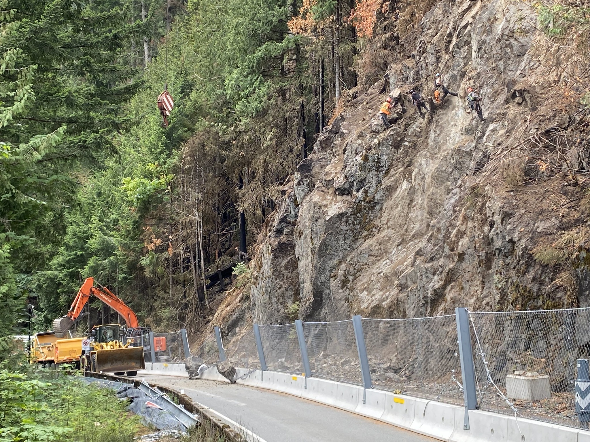 Since July 17 crews have worked the steep slope over Cameron Lake, clearing loose rocks and dangerously burned trees to permanently restore the only highway access to Port Alberni and communities in the Clayoquot and Barkley Sound regions. This work has brought temporary closures, usually 9 a.m. to 11:30 a.m. and 1:30 p.m. to 5 p.m. on weekdays to the seven-kilometre section of highway along Cameron Lake and Cathedral Grove.