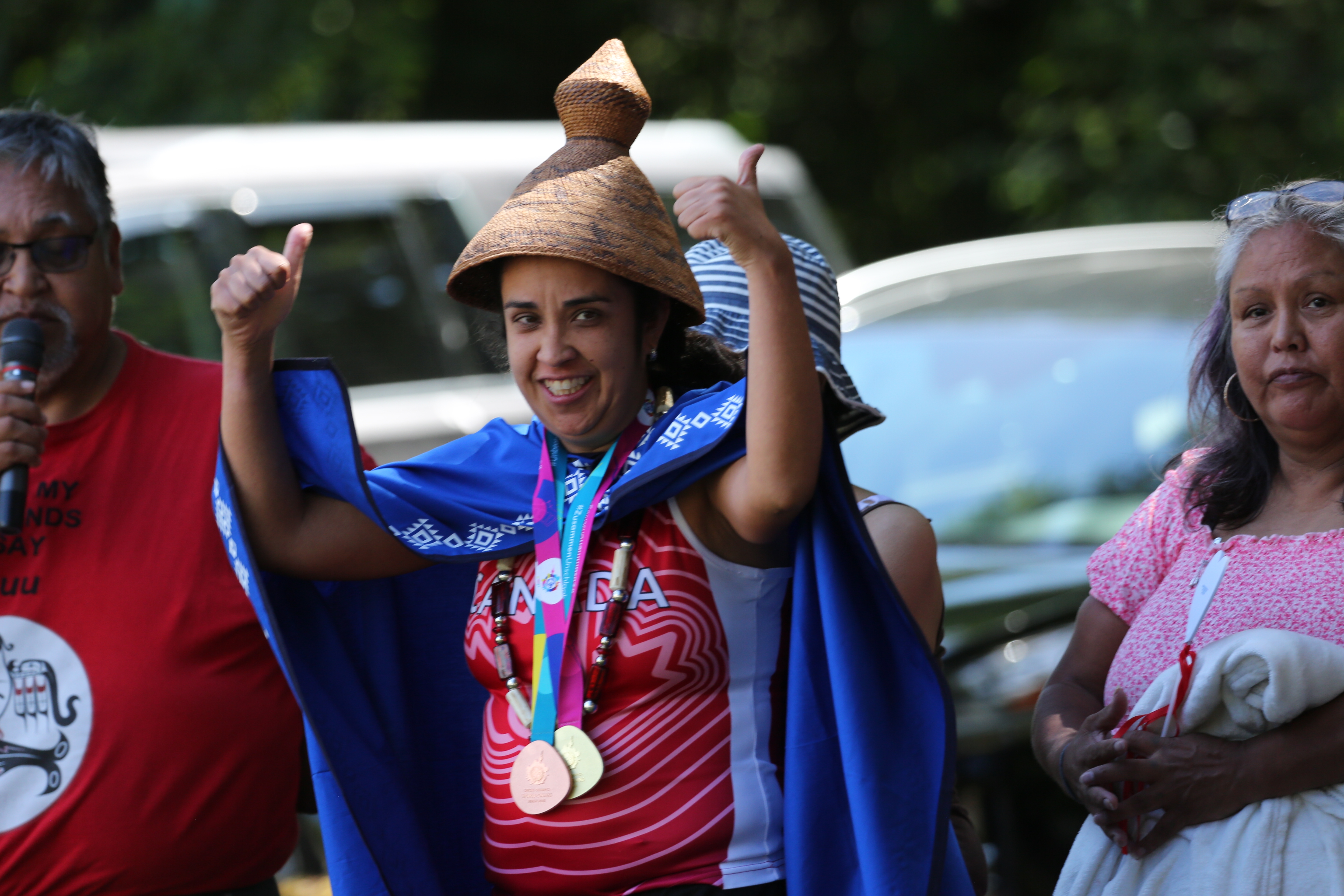 The recent World Games in Berlin, Germany were particularly successful for Jolyn, as she also came home from the international event with a bronze medal in the women’s 4x400 relay event. It’s an inspiring result that the Tseshaht formally recognized on Saturday, Aug. 12 with a gathering at the Paper Mil Dam Park on the First Nation’s reserve.
