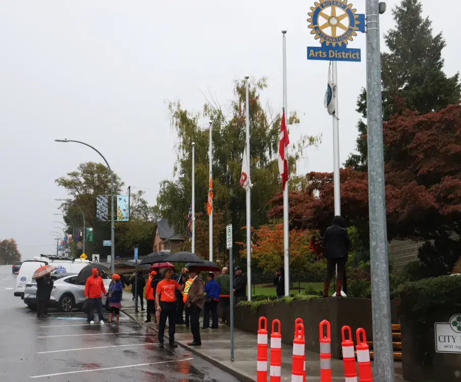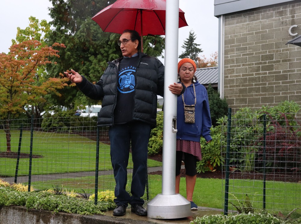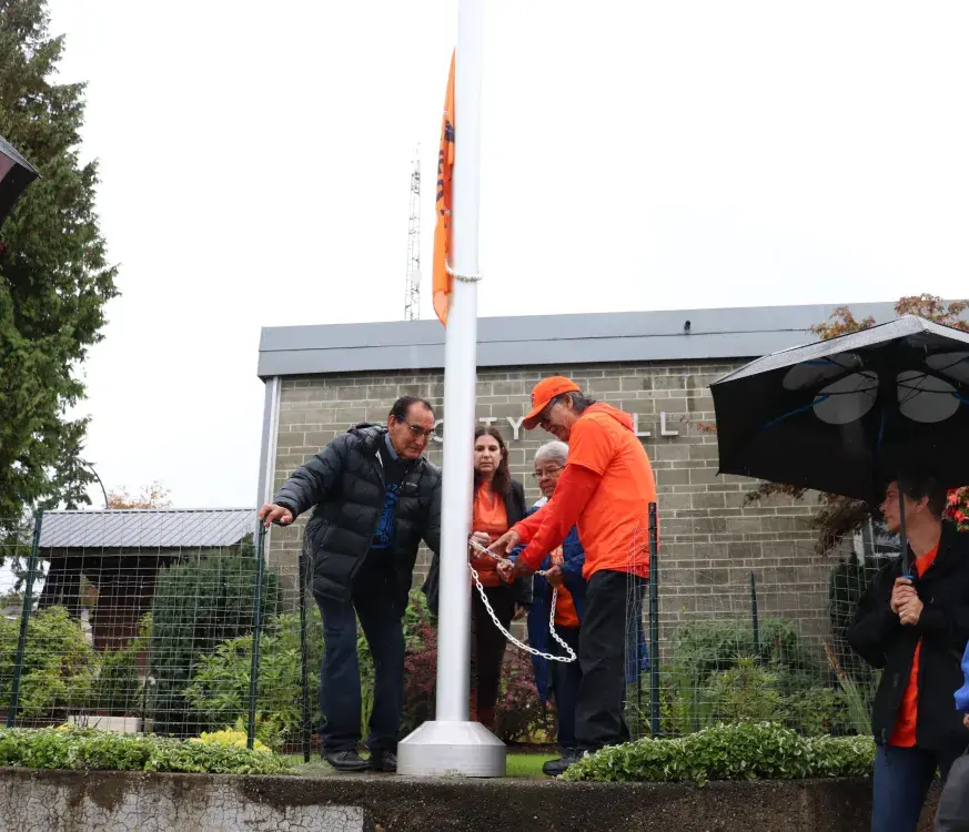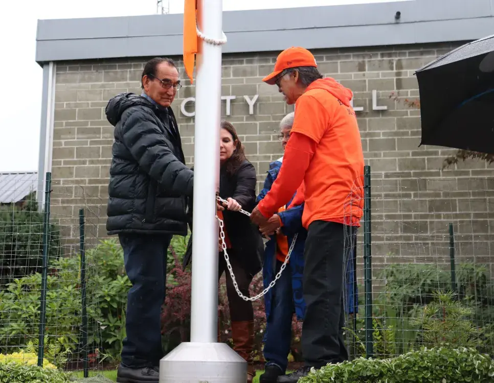 As the rain poured down on Sept. 25, Wally Samuel, Tom Watts, and Geraldine Edgar-Tom, residential school survivors, raised the bright orange flag of reconciliation to half mast in front of the Port Alberni City Hall. This is one of many flag raising ceremonies happening this week in recognition of National Day for Truth and Reconciliation on Sept. 30.