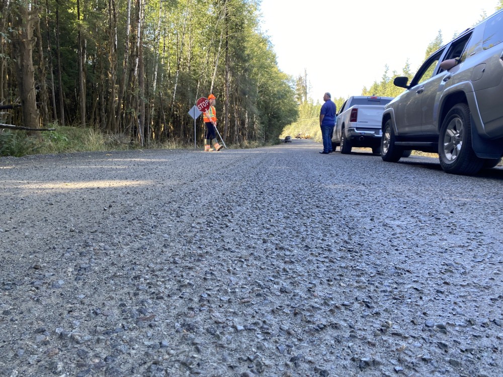 The road surfacing began halfway down at kilometre 36, as throughout the summer the upper half of Bamfield Main served as a detour route for Highway 4. This major route suffered ongoing delays and closures by Cameron Lake from a forest fire that started in early June.
