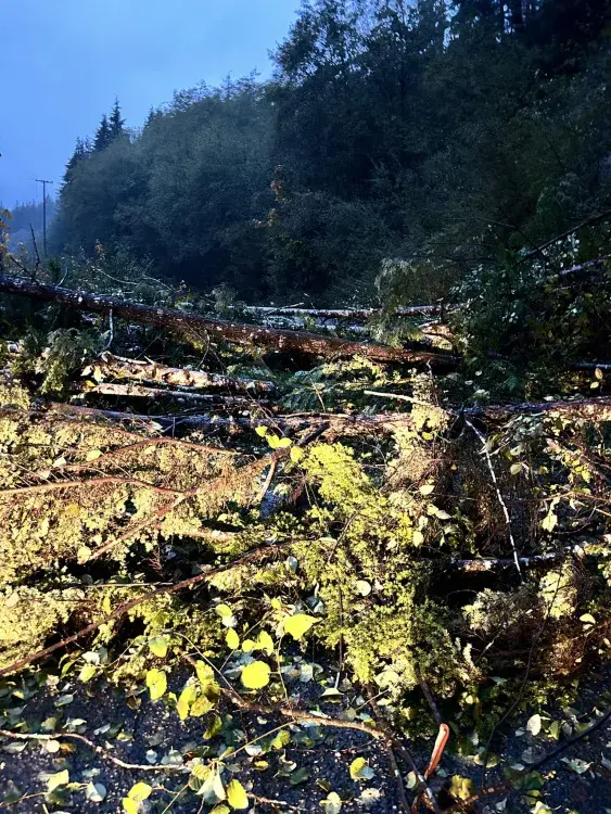 He added that the trees were on an embankment above the road and with the heavy wind and rain after a hot, dry summer, the trees slid down onto the roadway.
