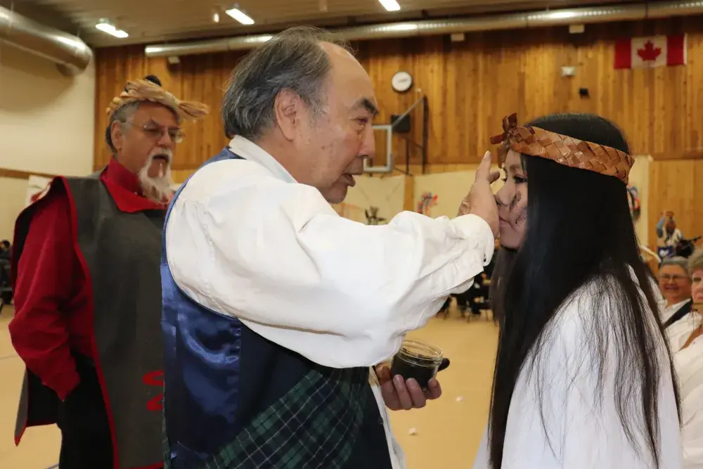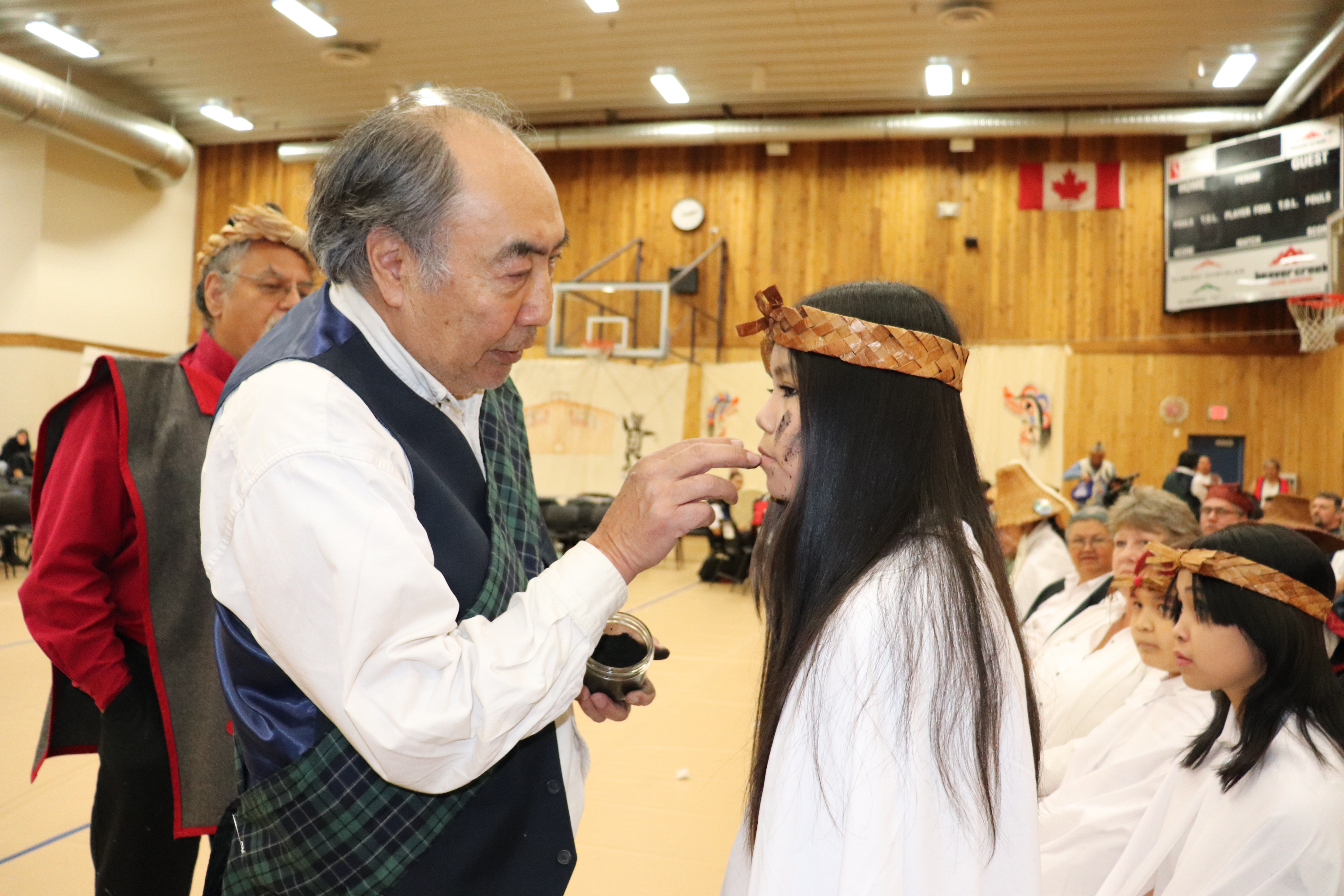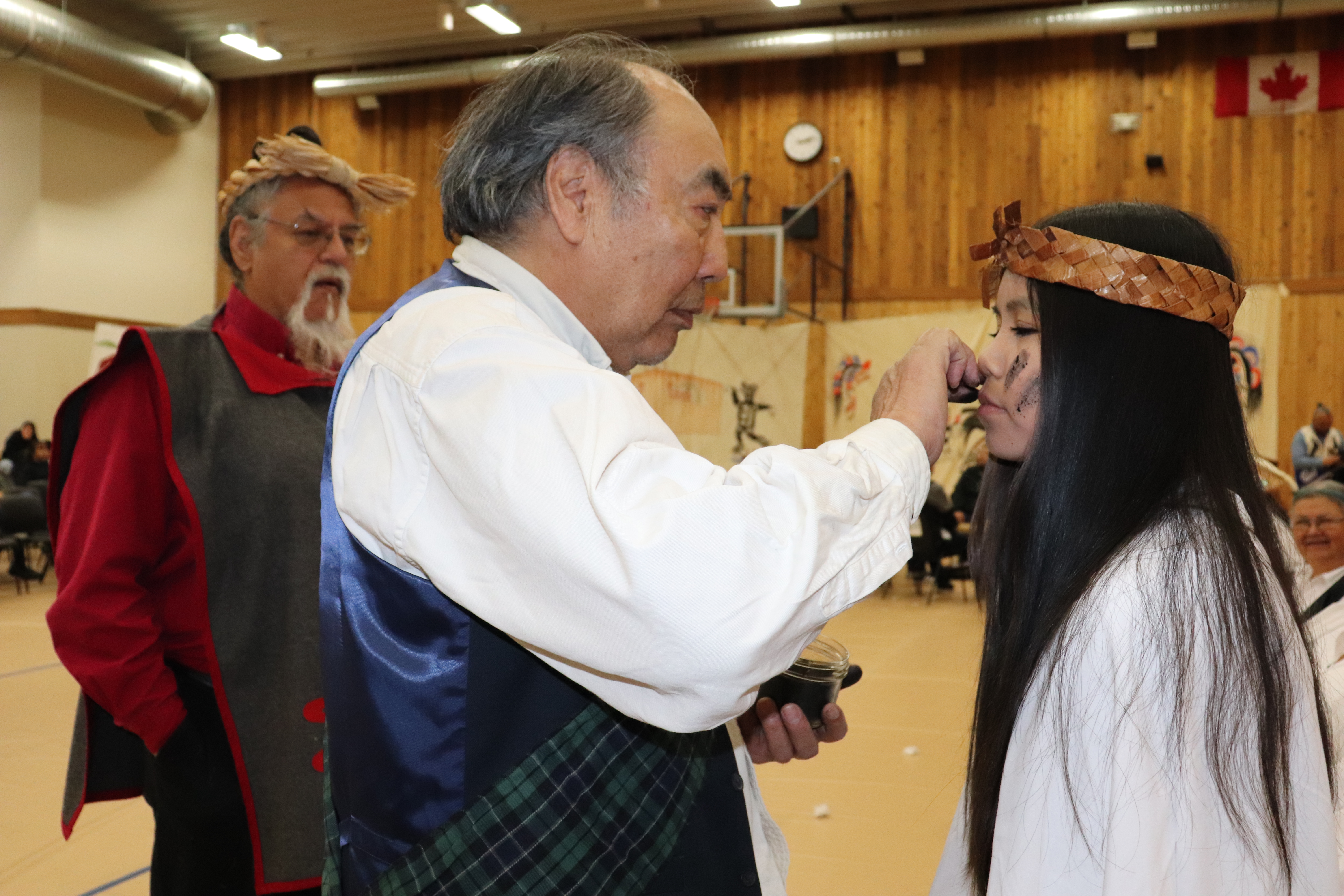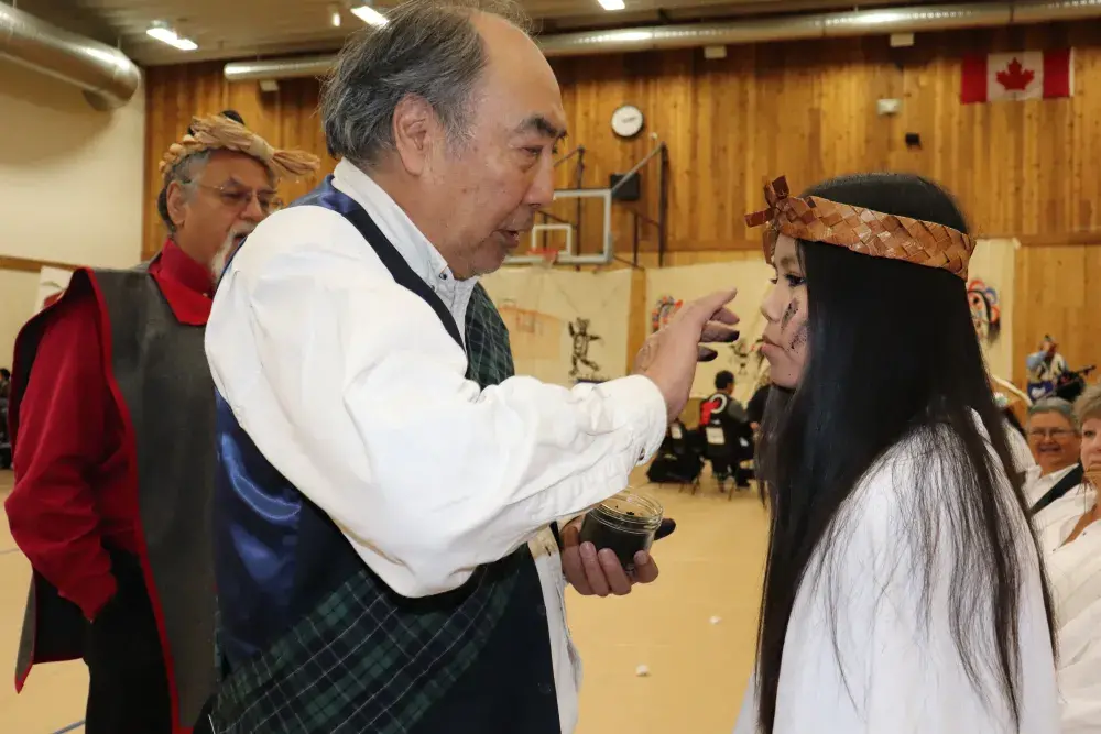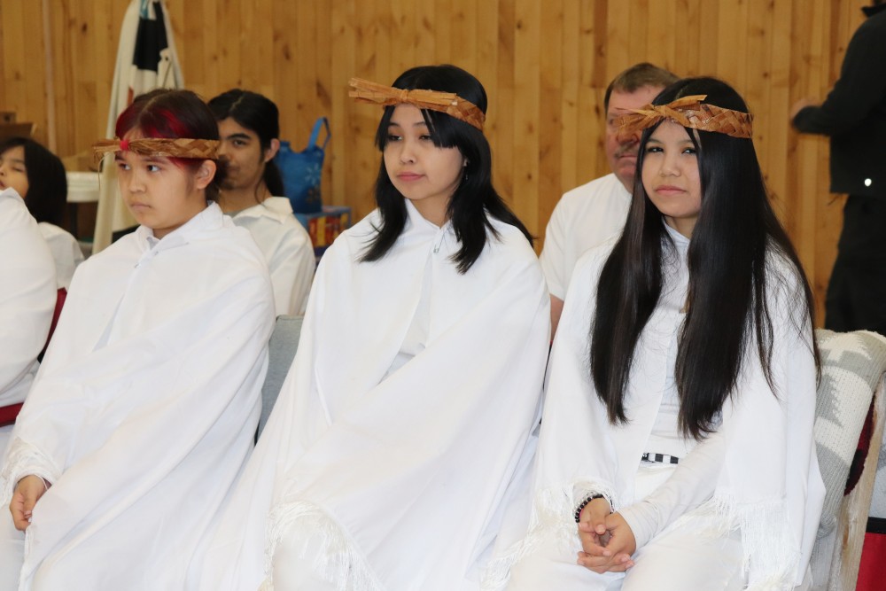 One-by-one, each young woman received a name from Yał luu a. The names were printed on tags hung around each girls’ neck as a speaker explained the meaning of the name, or why it was chosen for that particular person. The names, said speaker Haa’yuups, mean that Yał luu a claims them as his own and in proof that they belong in his house.