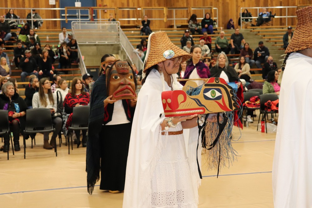 The event started with an aitstuthla, or coming of age ceremony, for the young women of the Cook house. Yał luu a’s speaker told the crowd that the ha’wilth was standing up the young ladies as adults on that day. The young women, all dressed in white, were escorted onto the floor and placed in front-row seats where they were surrounded by people that were there to protect them.