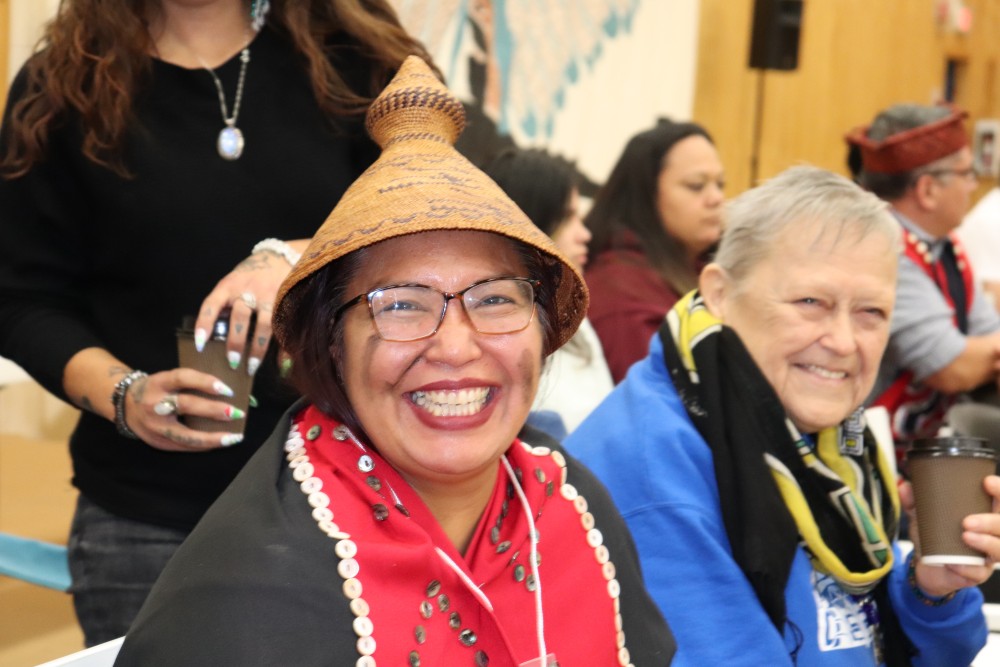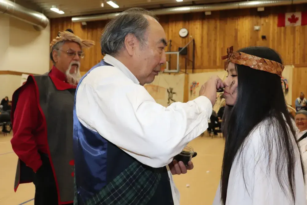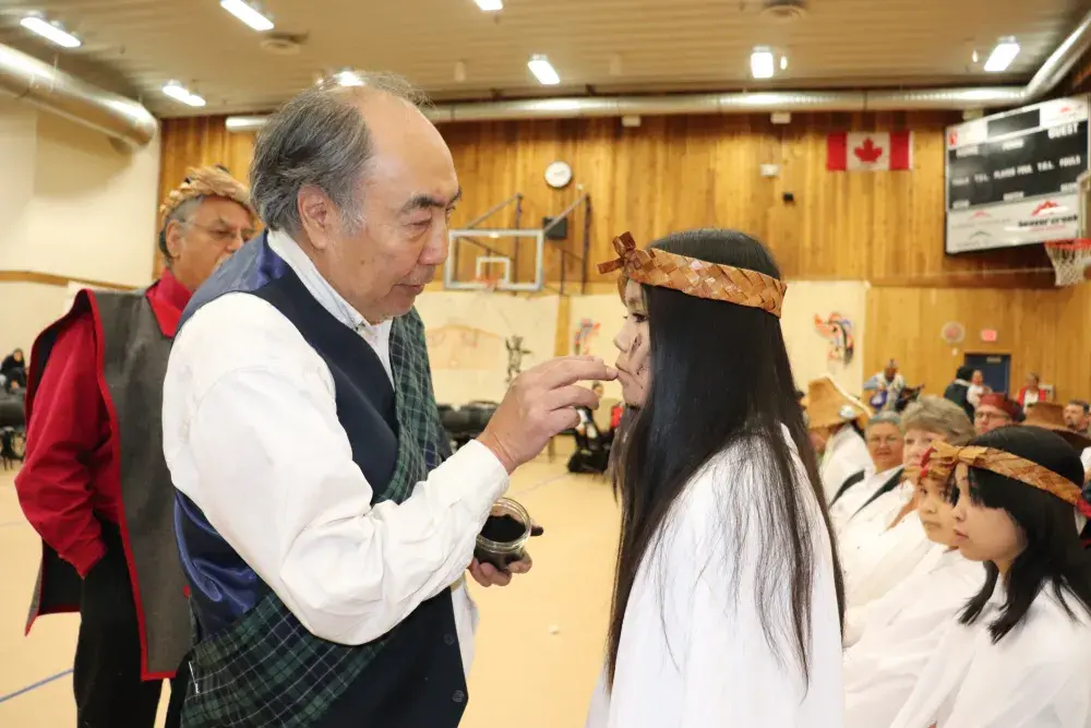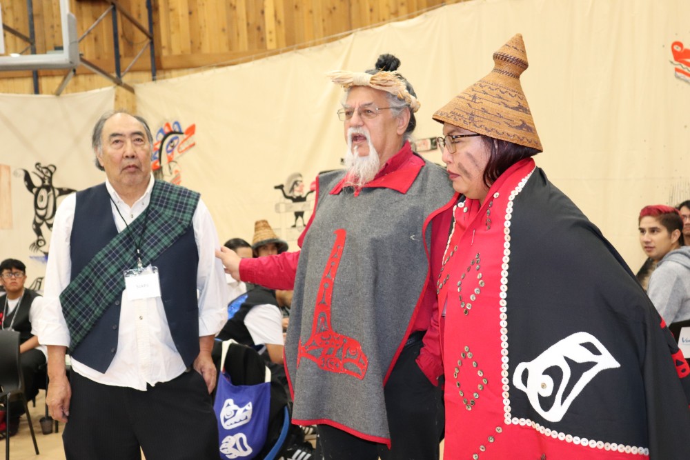 Calling his daughter Sherri to his side, through his speaker Yał luu a announced that he would be giving her his chieftainship to hold until her own son is ready to take the seat. Removing his woven cedar chief’s hat, he placed it on his daughter’s head as the crowd applauded.