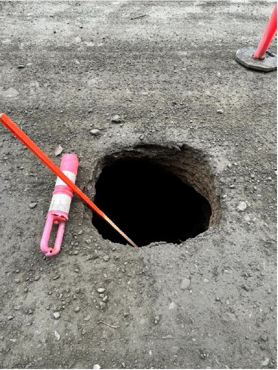 A hole large enough for a person to fall into was found on the road near Nitinaht on Saturday, a hazard that highlights the need for better alternative access to communities on western Vancouver Island.