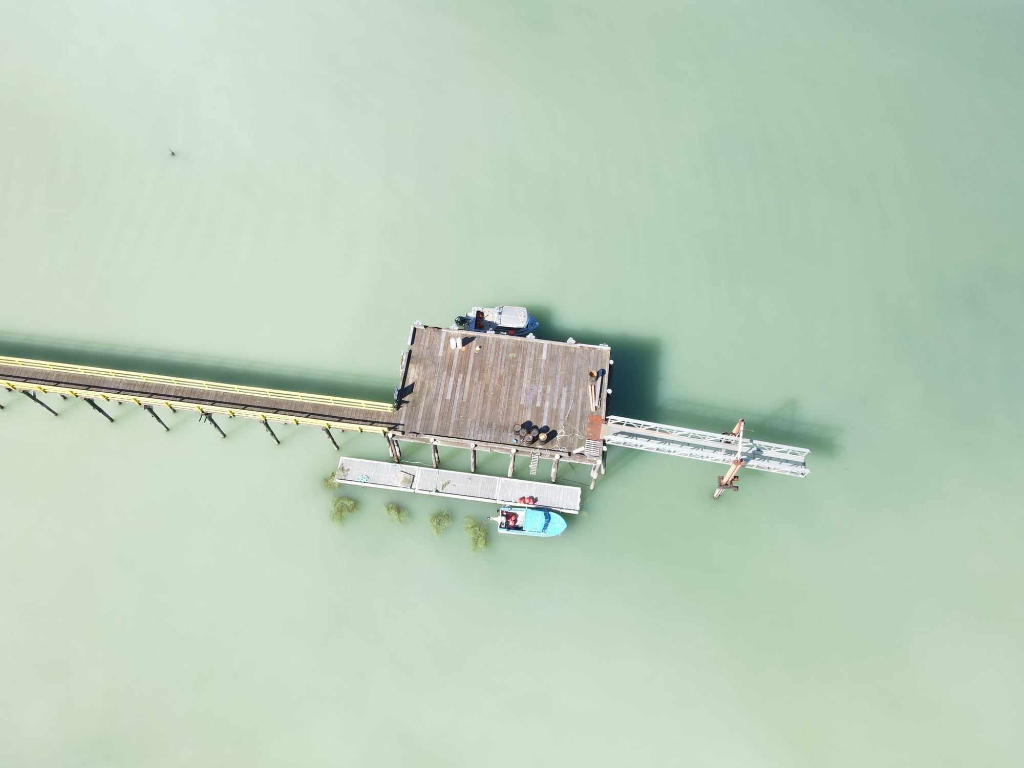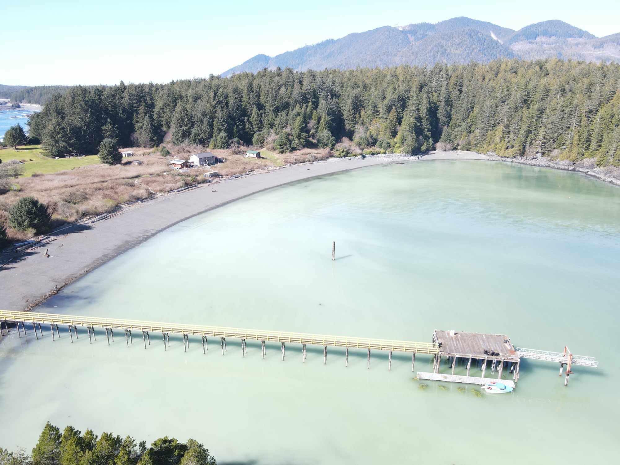 Darrell Williams in Yuquot reported that the spawn started in their harbour on Friday, March 16. He was able to get drone shots of the scene, where the water in the entire basin turned a milky jade greed from the spawn. He tied branches off of the float where the boats land to harvest some k̓ʷaqmis.