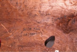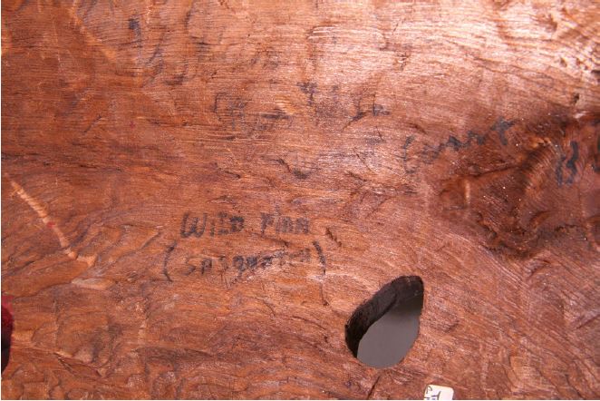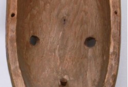 The first mask, believed to be taken from a Nuu-chah-nulth grave, is made of red cedar measuring 14 inches by 7.5 by 6.25 inches and weighs two pounds six ounces. It has no artist’s signature and depicts a human face painted with red ochre, grey, blue and black paint. There is a nail head in the centre of the upper lip which holds a red cedar bite stick on the inside of the mask. The bite stick allows a dancer to hold the mask in position while dancing.