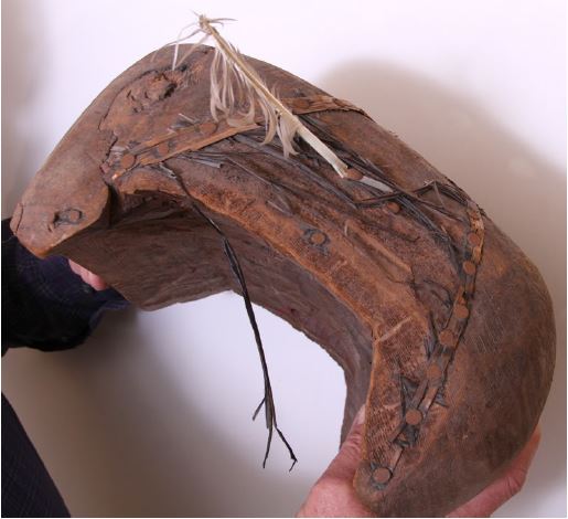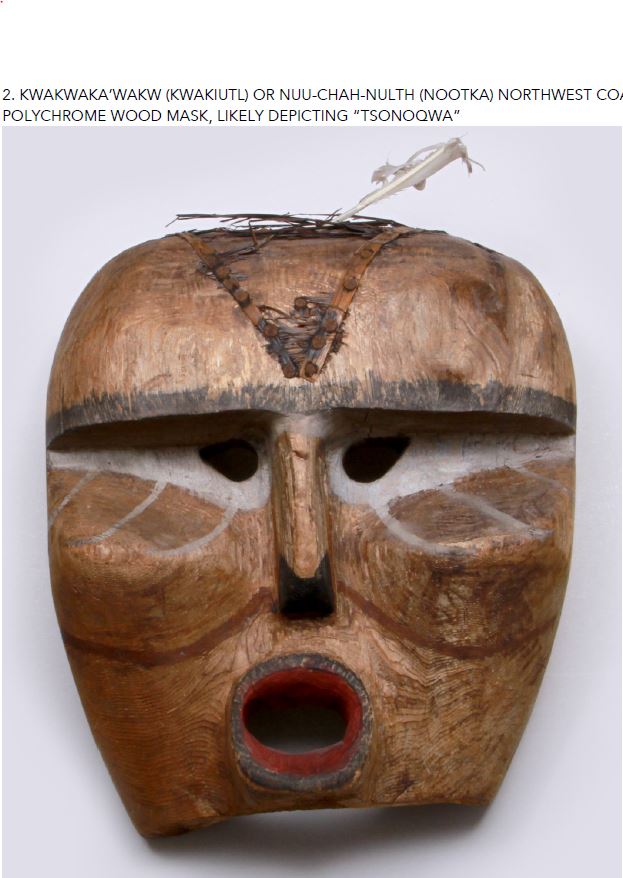 The second mask is believed to be either a Nuu-chah-nulth or Kwakwaka’wakw rendering of a sasquatch or Tsonoqwa and was created about 1900. It is made of red cedar wood, bark, paint, nails and a white feather. It measures 12.24 inches by 11.25 by 6.5 inches and weighs 4 lb. 6.2 oz with no signature.
