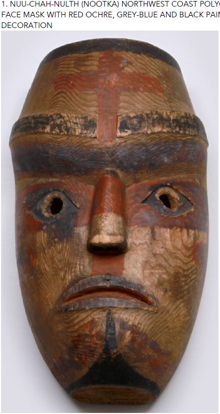 Notes included with information about the masks say that “Nootka” carvings (along with those of other tribal groups) were “collected” by Spanish and English explorers as early as the 18th century.