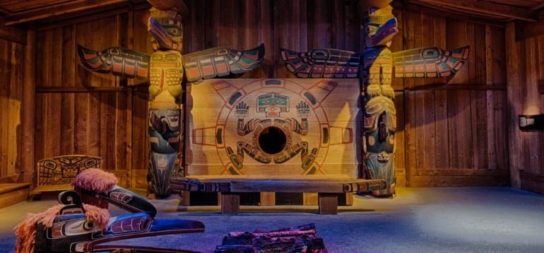 The Jonathan Hunt House is a ceremonial piece and museum installation that allows visitors to enter a re-creation of the house of Chief Kwakwabalasami, the late Jonathan Hunt, a Kwakwaka’wakw chief who was born and lived his life in the community of Tsaxis, near Fort Rupert, B.C.
