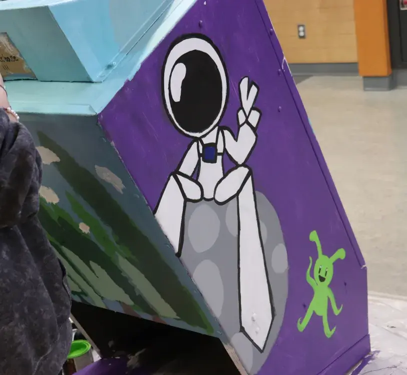 On either side of the trash bin are Tatoosh’s bright purple space scenes with an astronaut and an alien.