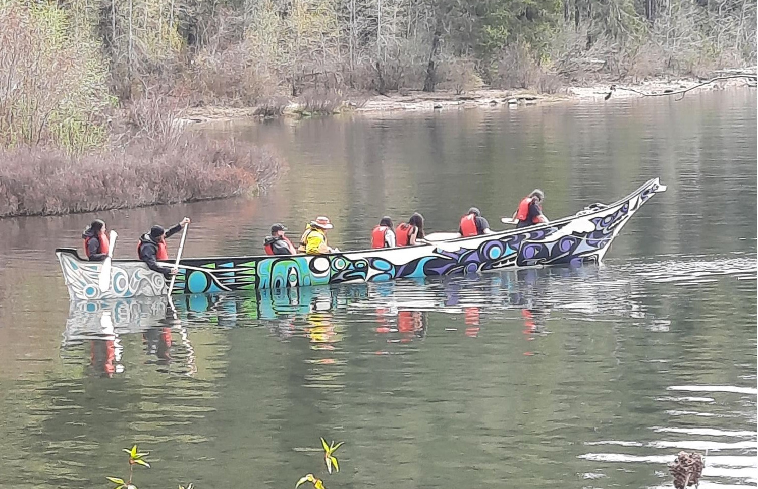Through a partnership between School District 70 and Usma Nuu-chah-nulth Family and Child Services, the agency has made available two traditionally designed canoes it owns to the Eighth Avenue Learning Centre in Port Alberni. In April three high school students as well as Dave Maher, SD70’s district principal for Learning and Innovation, and Indigenous Support Worker Leslie Taylor spent four days on Sproat Lake learning the dynamics of navigating the č’apac from a Paddle Canada instructor.