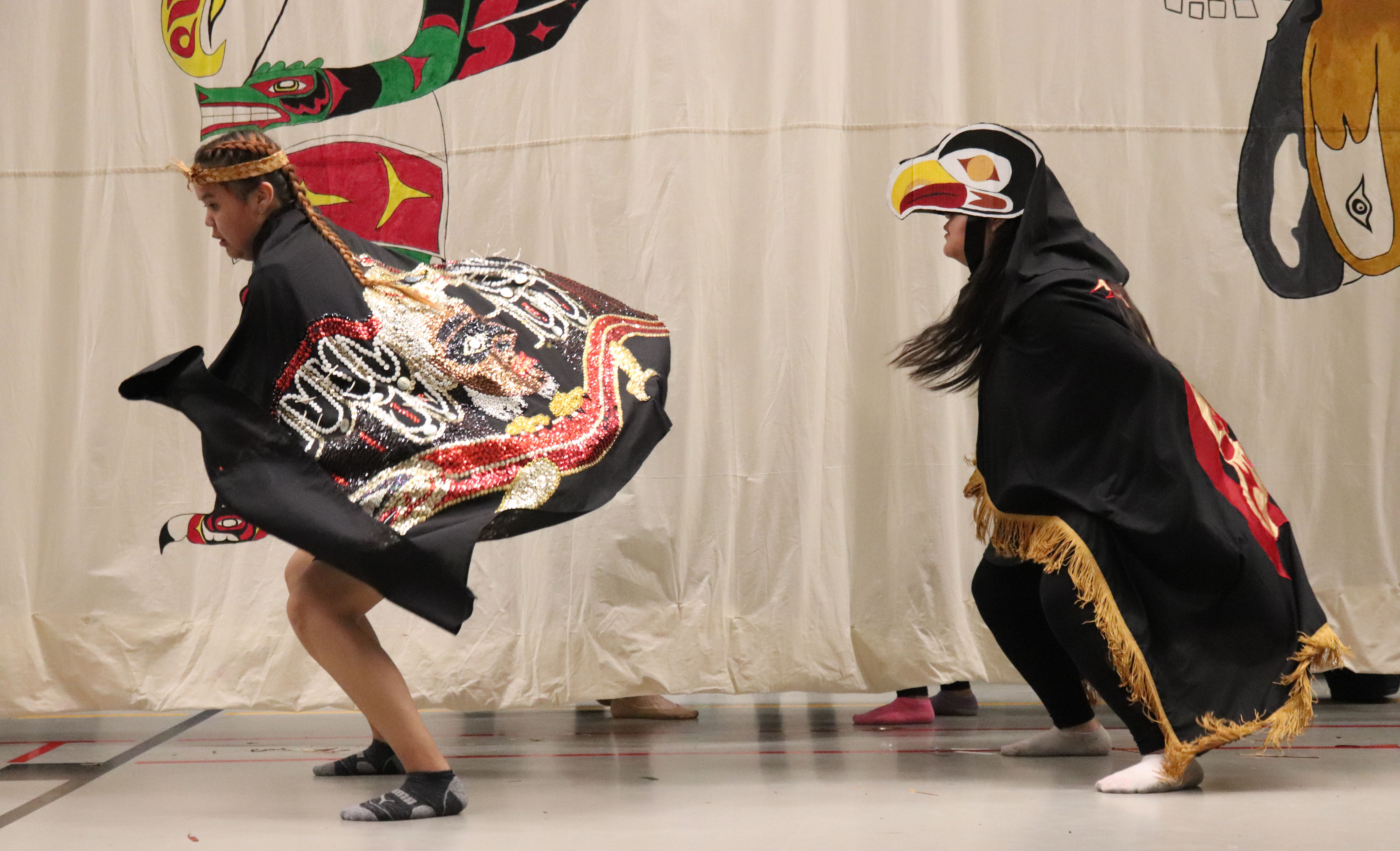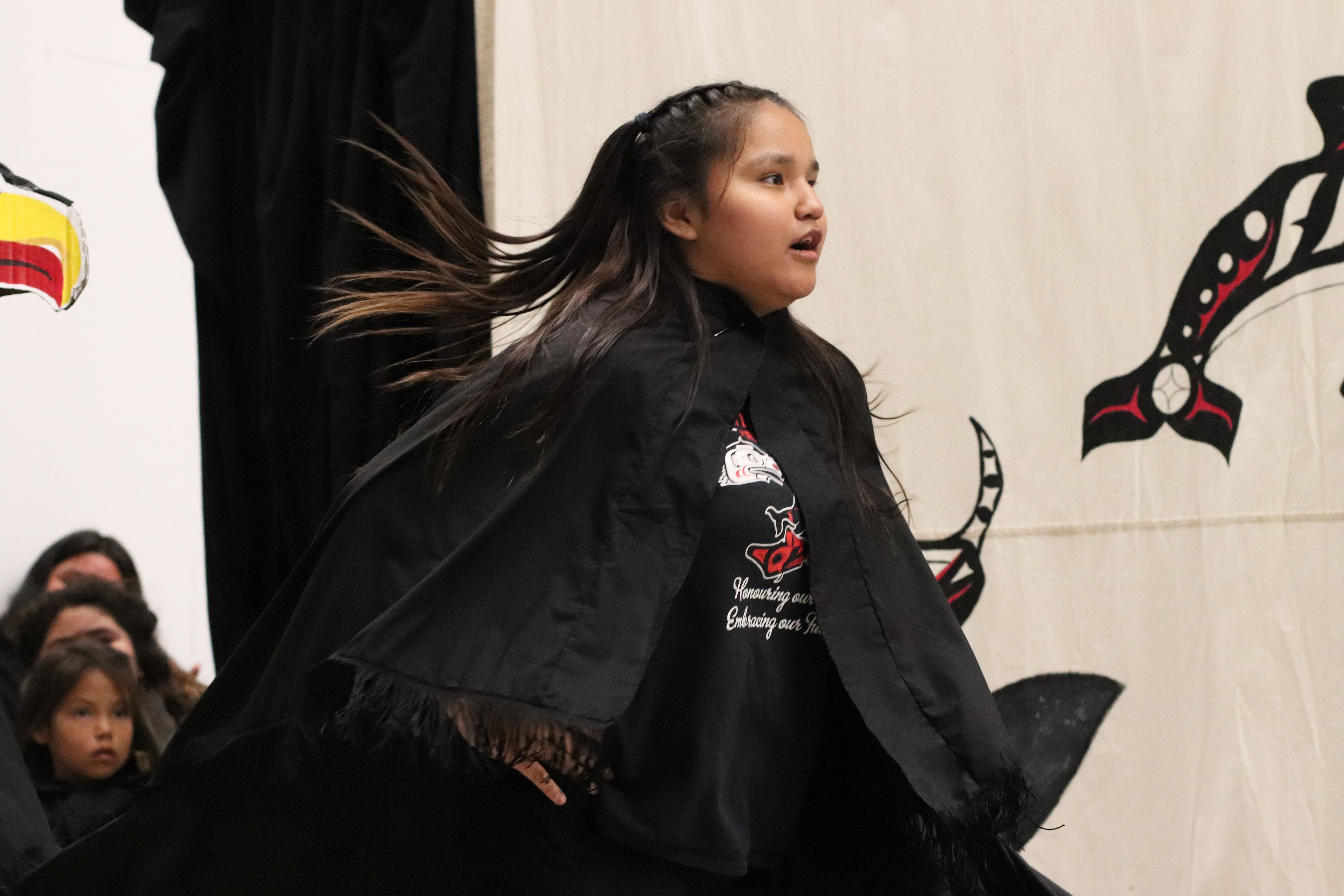 Students from KESS, the host school, Gold River Secondary School (GRSS), Ray Watkins Elementary, Captain Meares Elementary, Zeballos Elementary, K’ak’ot’lats’i School of Quatsino First Nation and T̓łisa̱lagi’lakw School of ‘Nagmis First Nation each took to the floor sharing songs and dances.