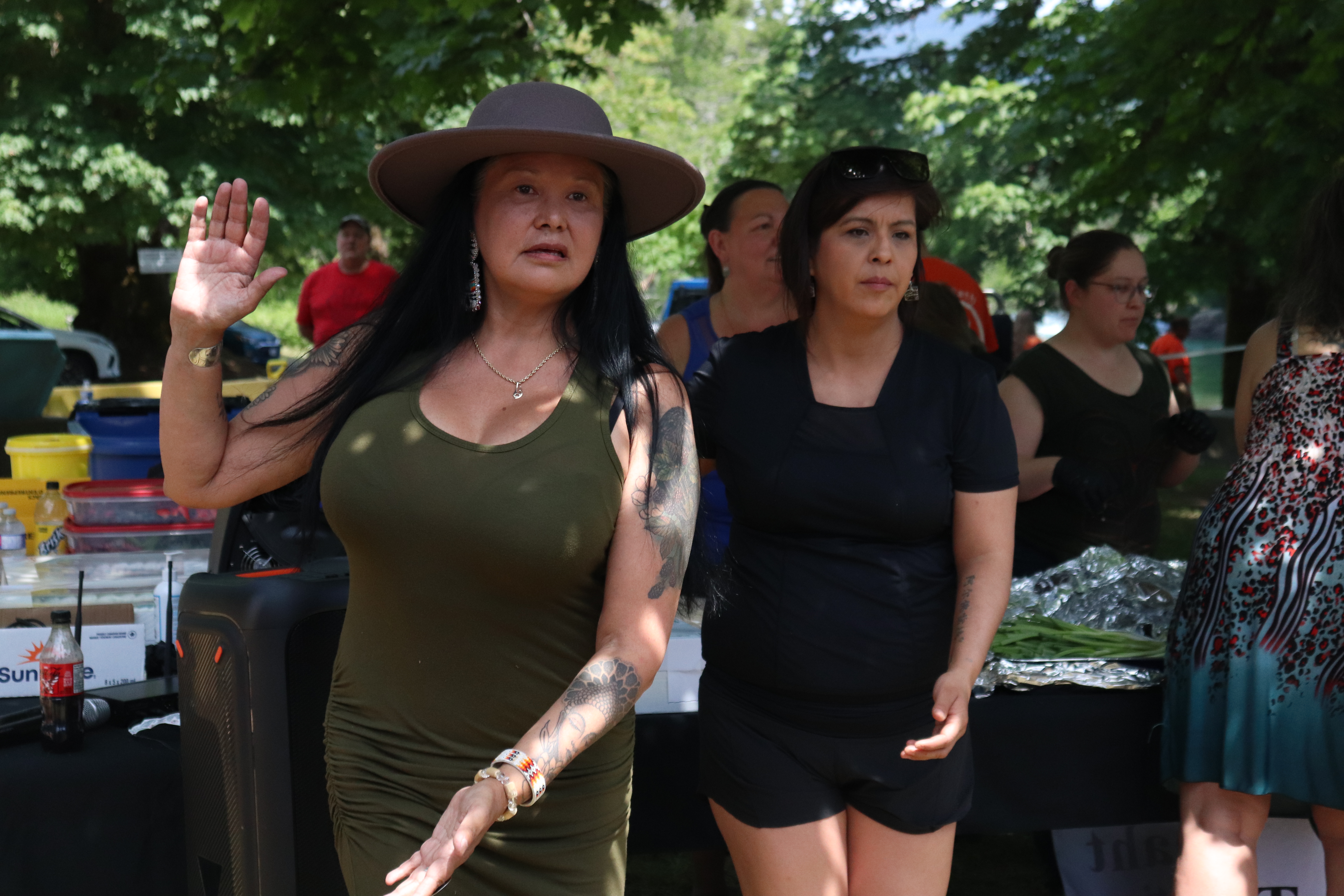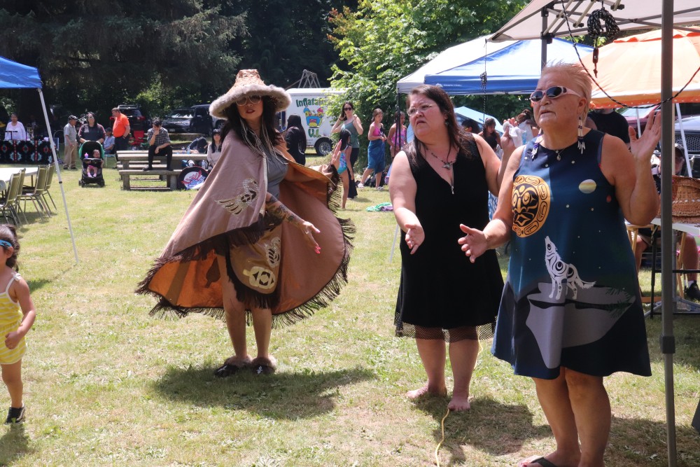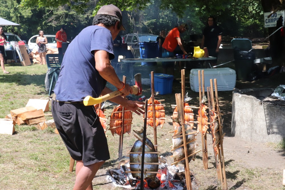Laughter and chatter filled the park, while salmon, cooked with cedar sticks on a fire. Hamburgers, and hotdogs were also served. The afternoon welcomed community singing and dancing, alongside Answer2Dance Group with Tseshaht’s Jessica Sault.