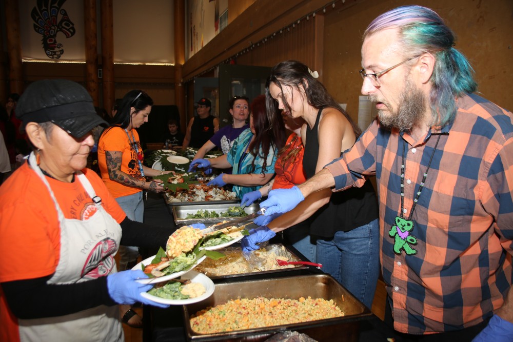 By 11 a.m. festivities got underway at the Port Alberni Friendship Center, which holds a lunch every year open to all in the community. This year a variety of items filled the plates, including crab, salmon and bannok. Candy and popcorn were available outside while a band played, as young ones engaged in face painting and crafts.