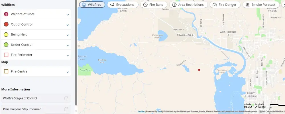 There is an out-of-control wildfire burning close to Tseshaht’s main reserve, located between Sproat Lake and Port Alberni.
