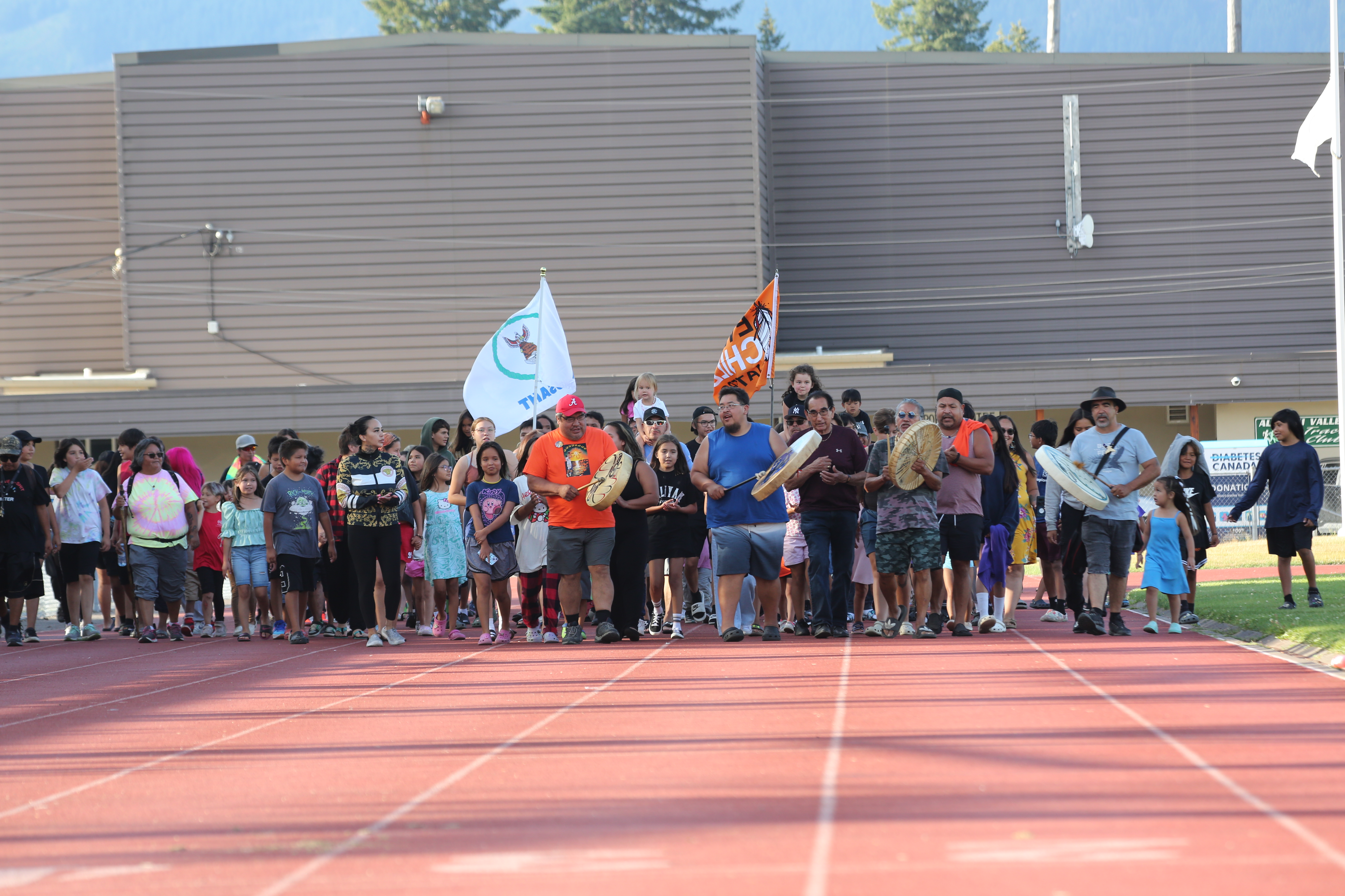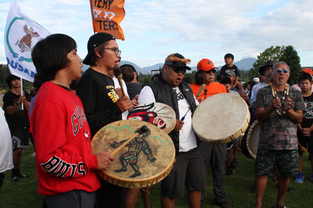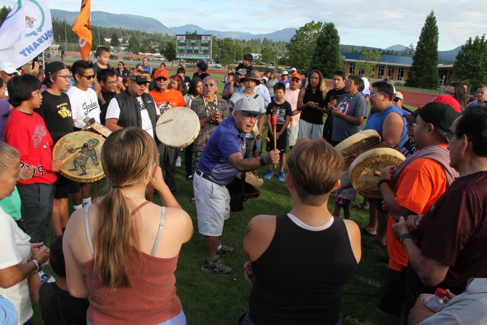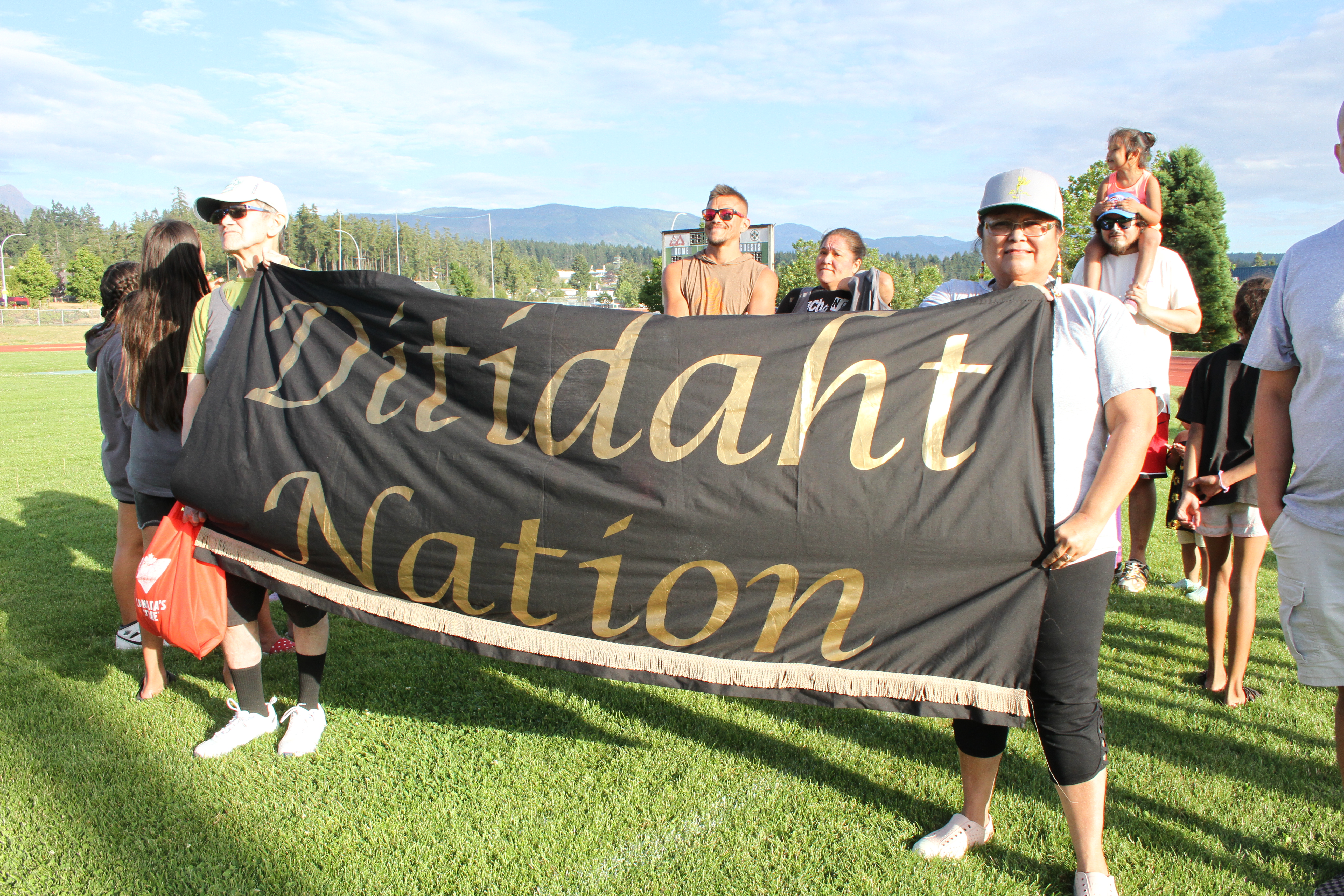 Eight teams came for the ceremonies, representing Ahousaht, Tseshaht, Hupacasath, Ditidaht, Tla-o-qui-aht, Uchucklesaht, Huu-ay-aht and the Healing Hearts group made up of the large extended family of Karen Sutherland, who are competing in honour of her surviving cancer. During the opening ceremonies on Saturday evening the teams followed the past tradition of marching down the track at Bob Dailey Stadium and performing several cultural songs with booming voices.