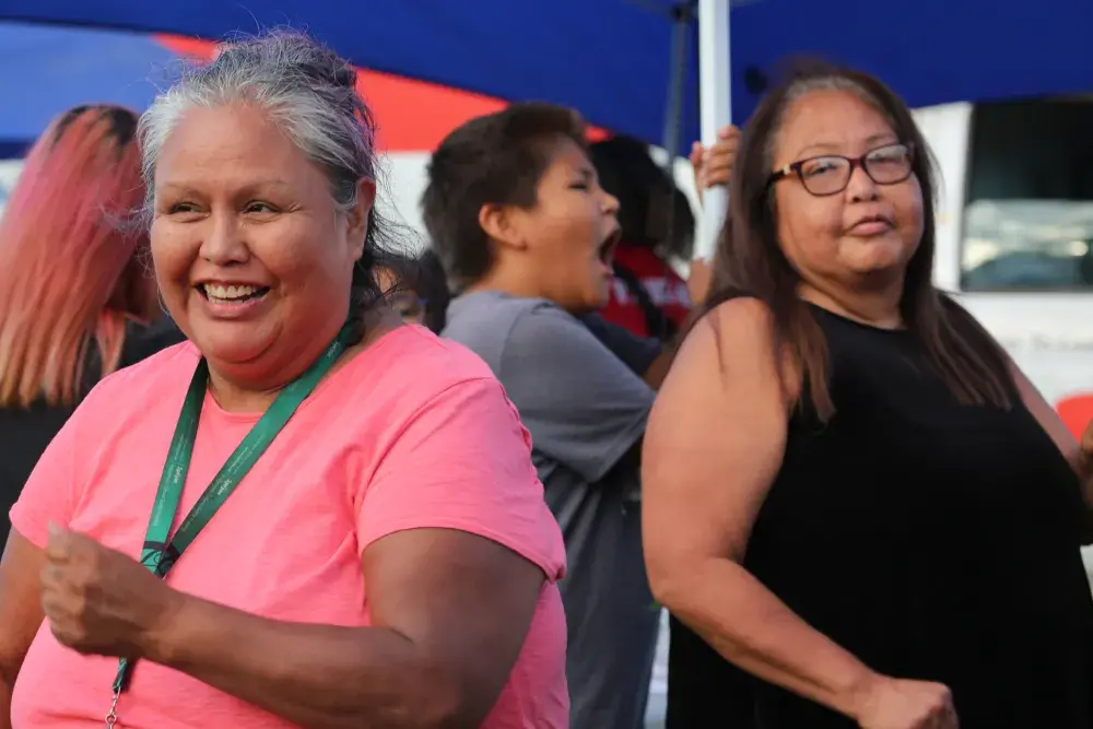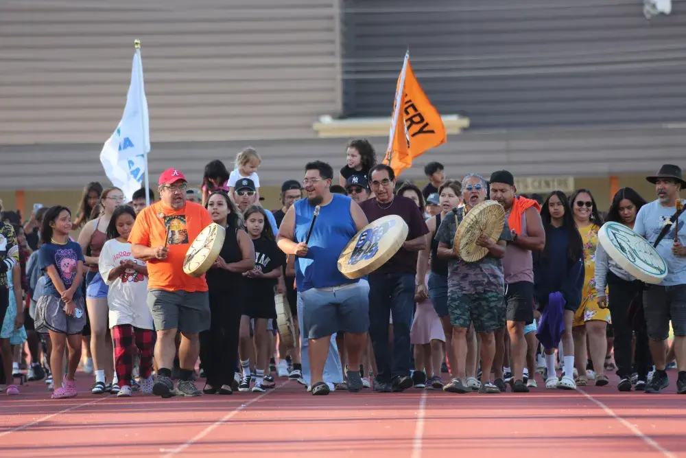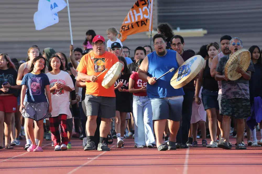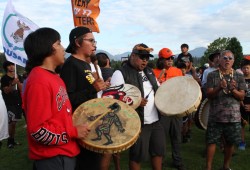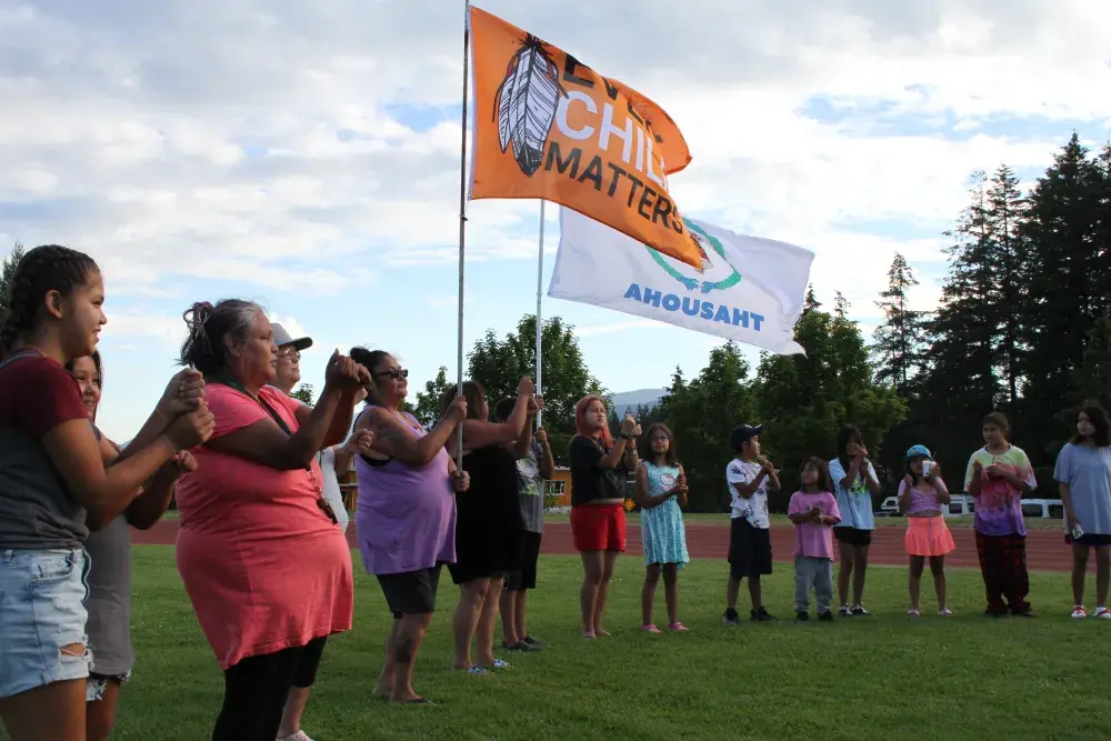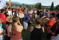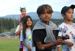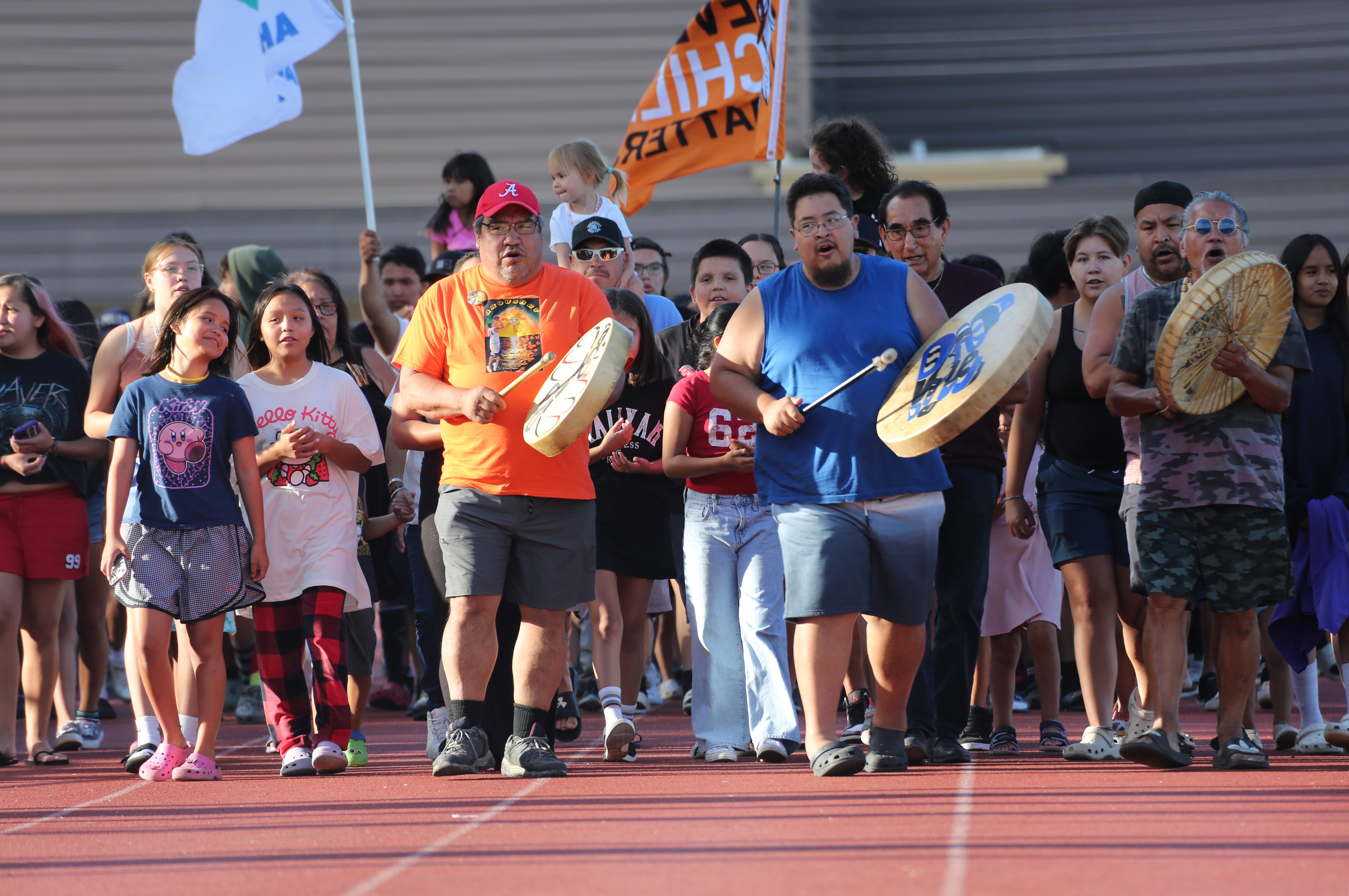 Eight teams came for the ceremonies, representing Ahousaht, Tseshaht, Hupacasath, Ditidaht, Tla-o-qui-aht, Uchucklesaht, Huu-ay-aht and the Healing Hearts group made up of the large extended family of Karen Sutherland, who are competing in honour of her surviving cancer. During the opening ceremonies on Saturday evening the teams followed the past tradition of marching down the track at Bob Dailey Stadium and performing several cultural songs with booming voices.