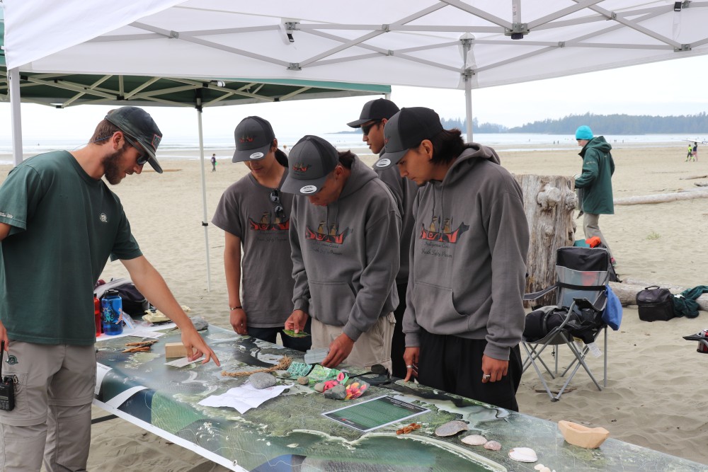 The young men use a giant map of the Pacific Rim to show landmarks. They have photo cards depicting wild berries and local vegetation, plus a collection of shells – scallop, varnish clams, cockle clam, mussel and limpit – to introduce beachgoers to the traditional intertidal smorgasbord.
