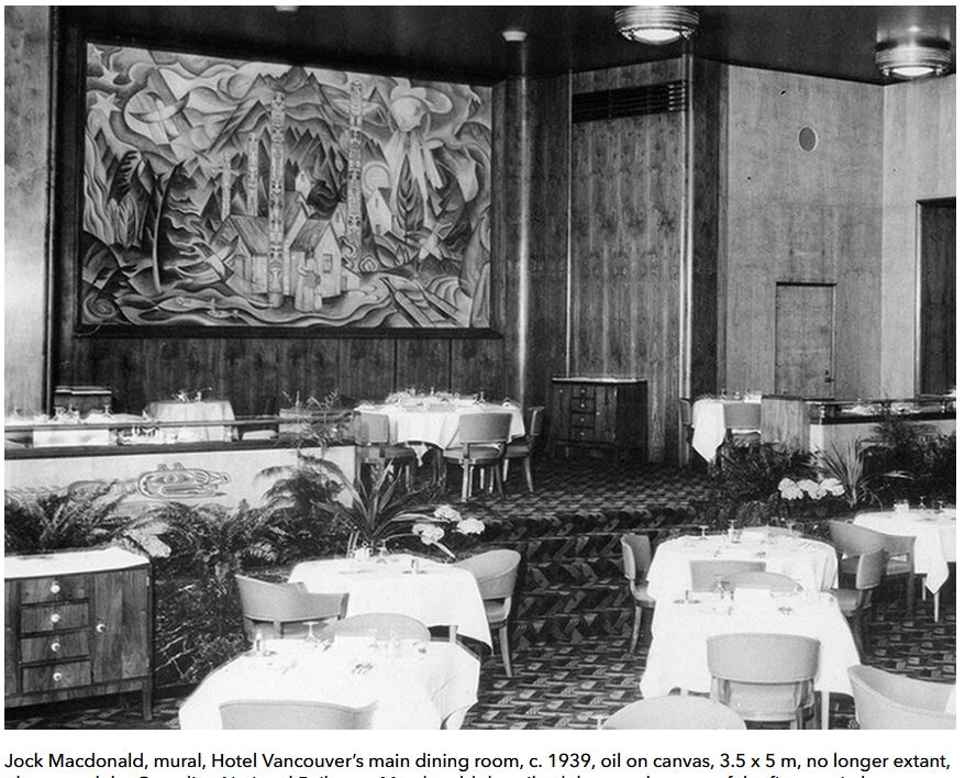 In 1939 McDonald was commissioned by Hotel Vancouver to paint a mural on the dining room wall. The mural was a scene from Yuquot featuring a house with a woman and child standing in front. They are surrounded by totem poles, forests and mountains. Jutting from the tree tops in the background, is a church steeple.