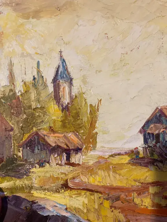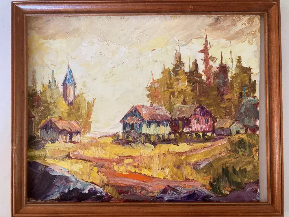 A woman shopping at a thrift store in Nelson, BC is intrigued by a framed painting. The thick, brilliantly coloured, oil paint brought to life a scene of a small, rugged settlement surrounded by rocks and forests. Priced at only $1, the woman took the beautiful painting home.
