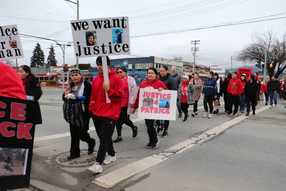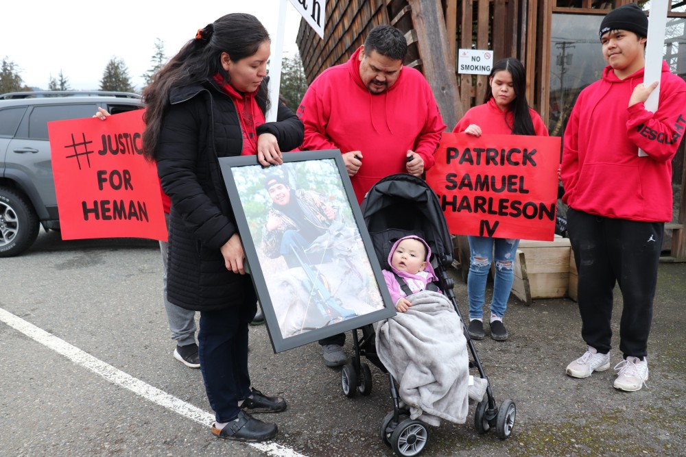 Friends and family of Patrick ‘He-Man’ Charleson IV took part in a short march on Feb. 27 to raise awareness about upcoming court hearings and community safety. Led by grieving father Patrick ‘Man’ Charleson III, who was pushing his infant daughter in a stroller, the small crowd gathered at the corner of Stamp Avenue and Roger Street in Port Alberni, waving placards and demanding justice for a young man lost.