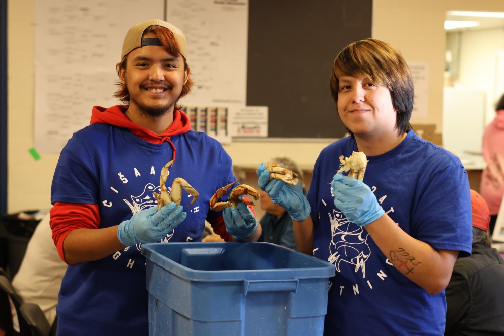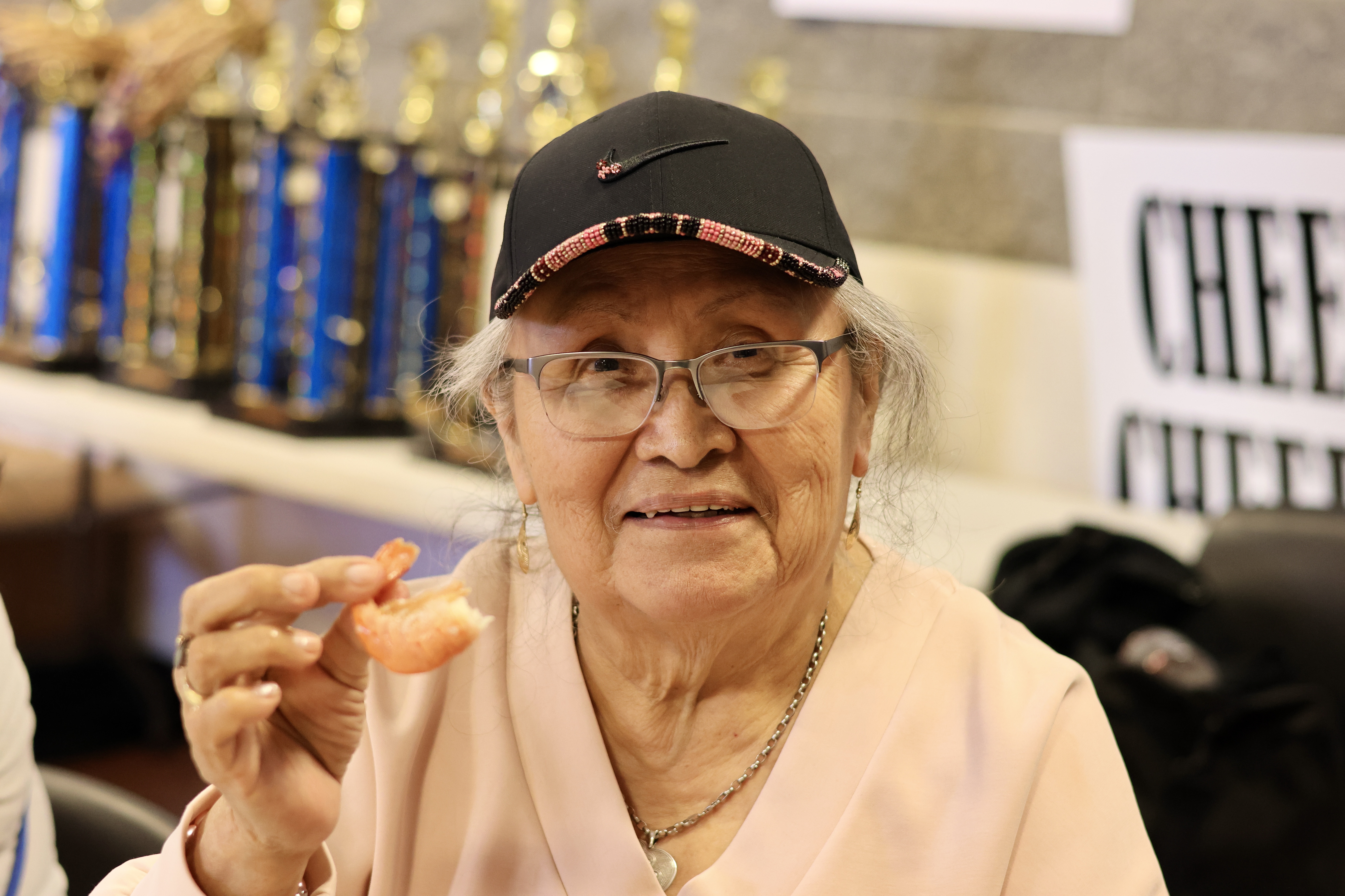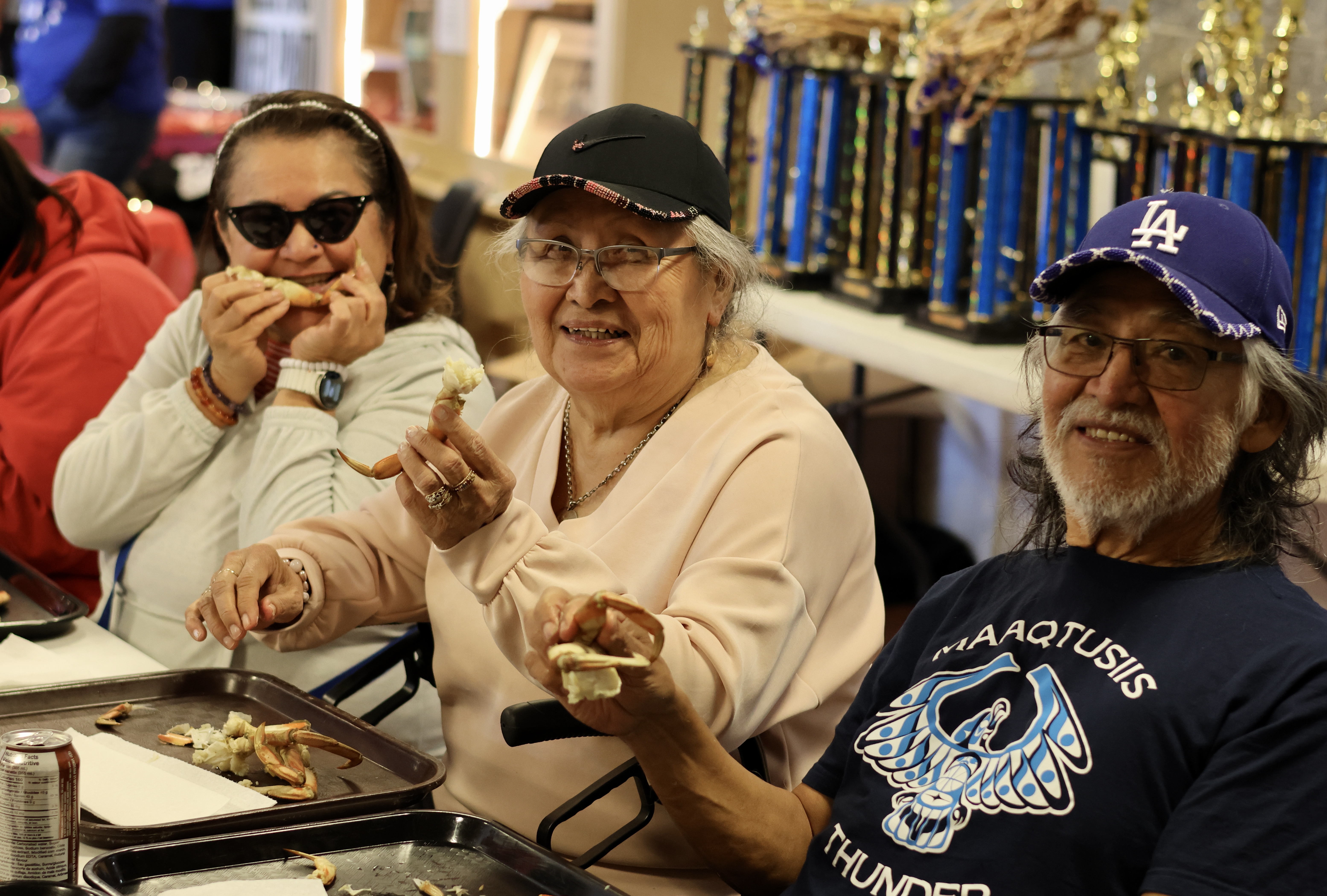 The elders looked happy cracking open crab with their hands on Sunday at the Alberni Athletic Hall during last day of the second annual Tseshaht Lightning Open Basketball Tournament.