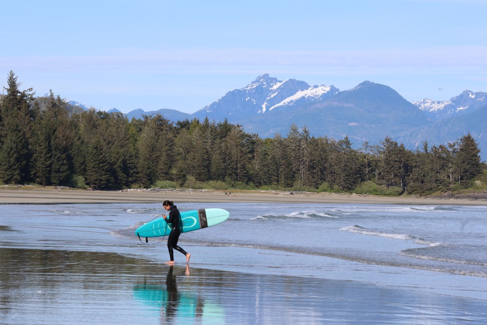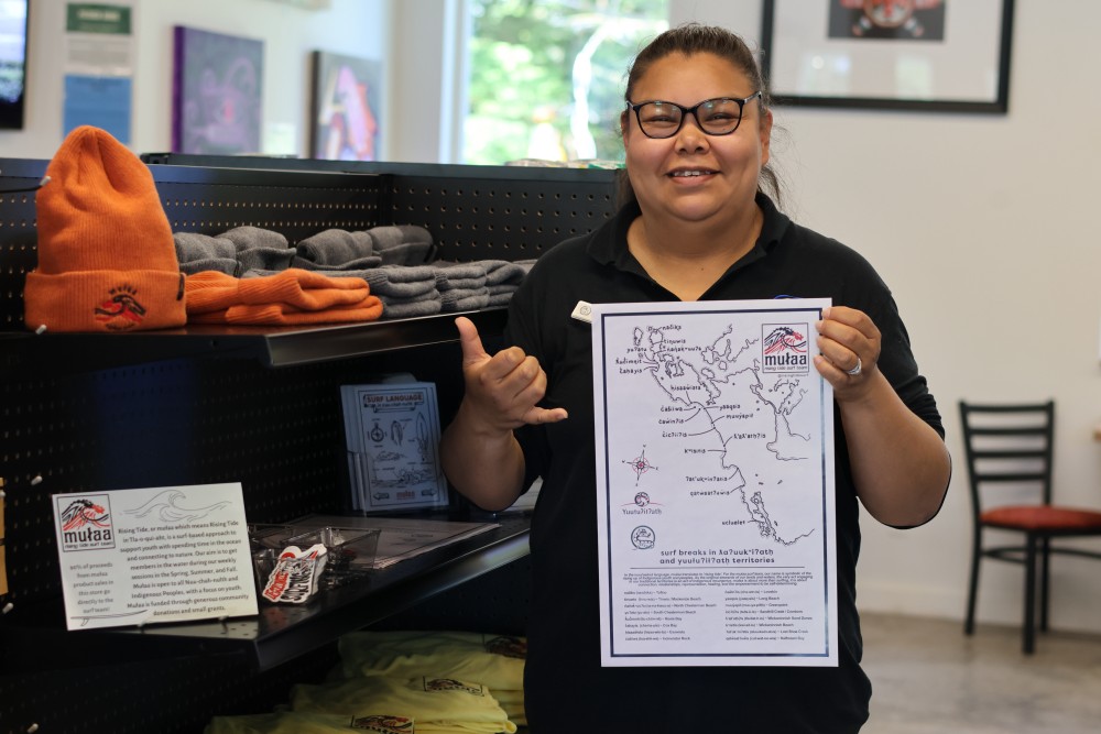 Anyone can come along for the ride too; mułaa worked with Gisele Martin at the Tla-o-qui-aht Language Department and Samantha Touchie from Yuułuʔiłʔatḥ Government to create a surf map that showcases the traditional names of surf breaks from načiks (Tofino) to Ucluelet.