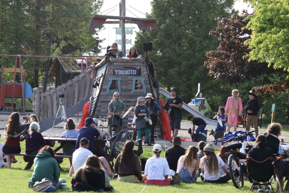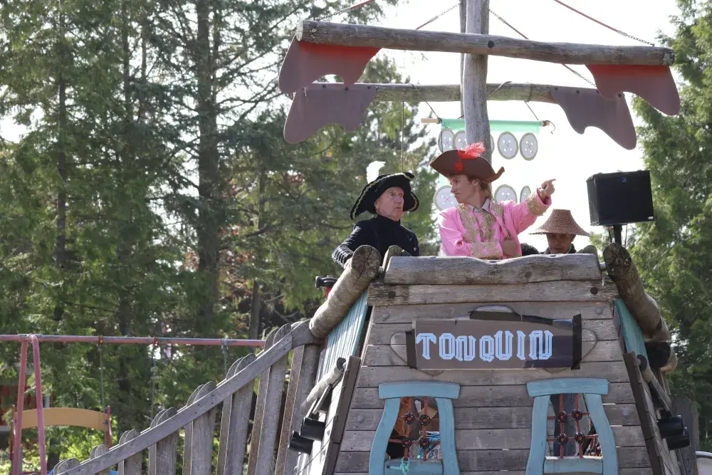 Children playing “Tla-o-qui-aht warriors” paddled in cardboard cutouts of dugout canoes around the wooden pirate ship play structure at Tofino’s Village Green to recount the fate of the Tonquin. The 269-ton American trade ship sank to the bottom of Clayoquot Sound in 1811 after being overwhelmed by the warriors – and blew up.