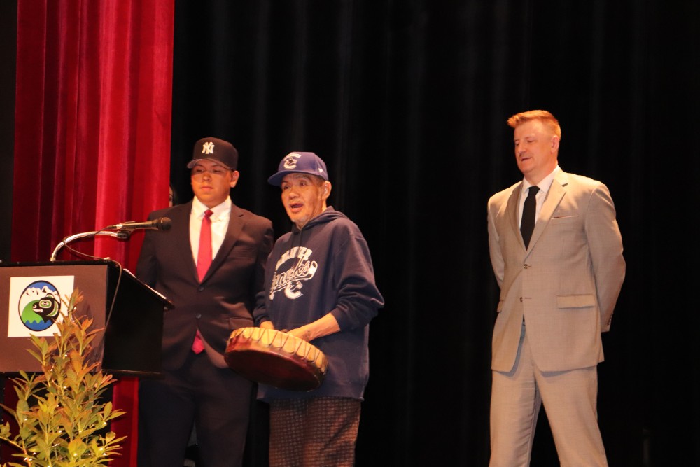 There were several Nuu-chah-nulth graduates in the group and the evening got off to a Nuu-chah-nulth start with words of welcome from Tseshaht’s Aaron Watts and Hupacasath’s Serena Mayer. Tamiko Rampanen, a Tseshaht First Nation councillor, also welcomed the crowd, saying that she also graduated from Eighth Avenue Learning Centre years before.
