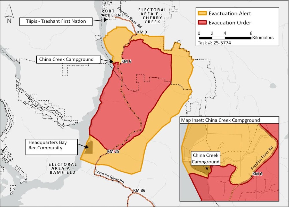 North of the fire, a state of emergency remains in place for the Tseshaht First Nation, the City of Port Alberni and the ACRD, but evacuation notices have been downgraded. On Aug. 20 the evacuation order for the China Creek Campground and Marina, which lies close to the forest fire, was changed to an alert, allowing people to return to the site if they choose. This lifting also applies to the nearby Headquarters Bay.