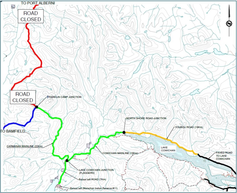 The southbound route from Port Alberni remains closed from the China Creek Campground and Marina to the Franklin River. A reopening date has yet to be announced.