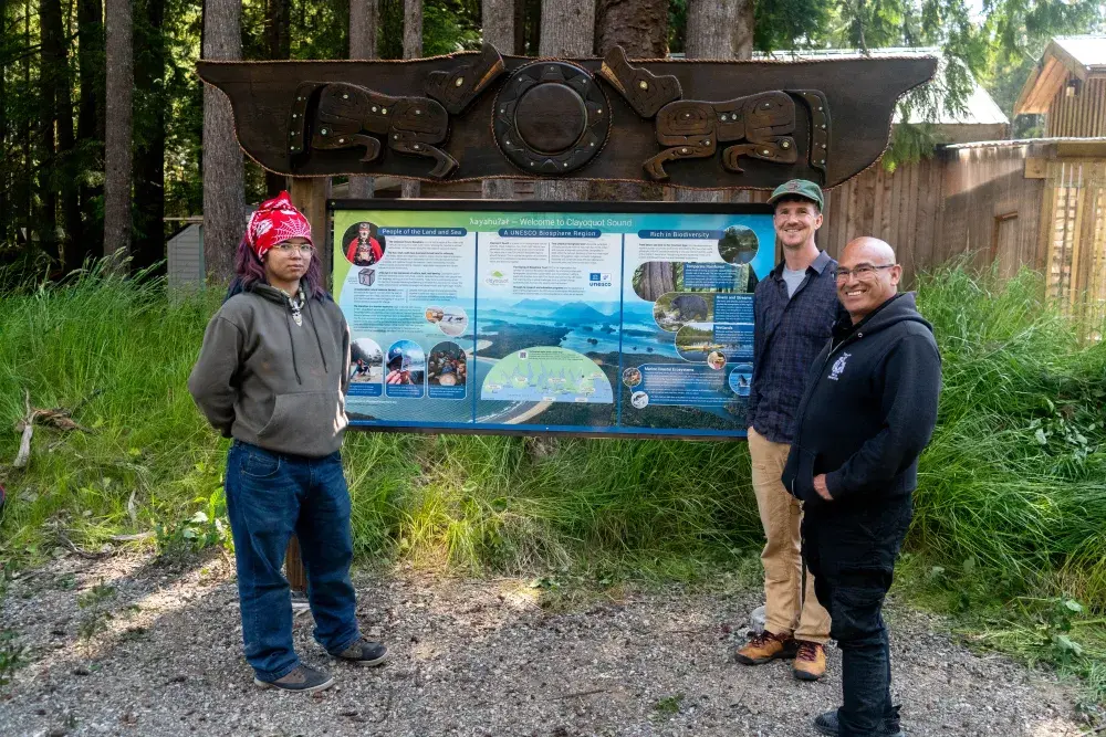 CBT also allocated a portion of the grant funding to each of the five Nuu-chah-nulth Nations within the UNESCO biosphere region (hiškʷiiʔatḥ (Hesquiaht First Nation), ʕaaḥuusʔatḥ (Ahousaht), ƛaʔuukʷiʔatḥ (Tla-o-qui-aht First Nations), Yuułuʔiłʔatḥ (Ucluelet First Nation), and tukʷaaʔatḥ (Toquaht Nation), so they could create their own signage independently.