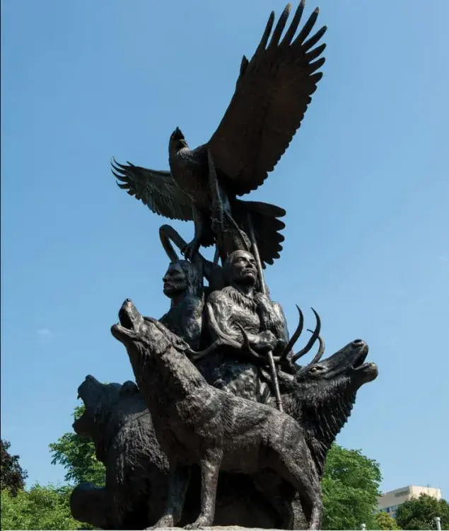 The monument was created by Cree artist Lloyd Pinay, and symbolizes the stories of First Nations, Inuit, and Métis people who served in wars and peacekeeping operations from the First World War to the present day. The monument features an eagle, figures representing Indigenous men and women, and the wolf, the bear and the bison.
