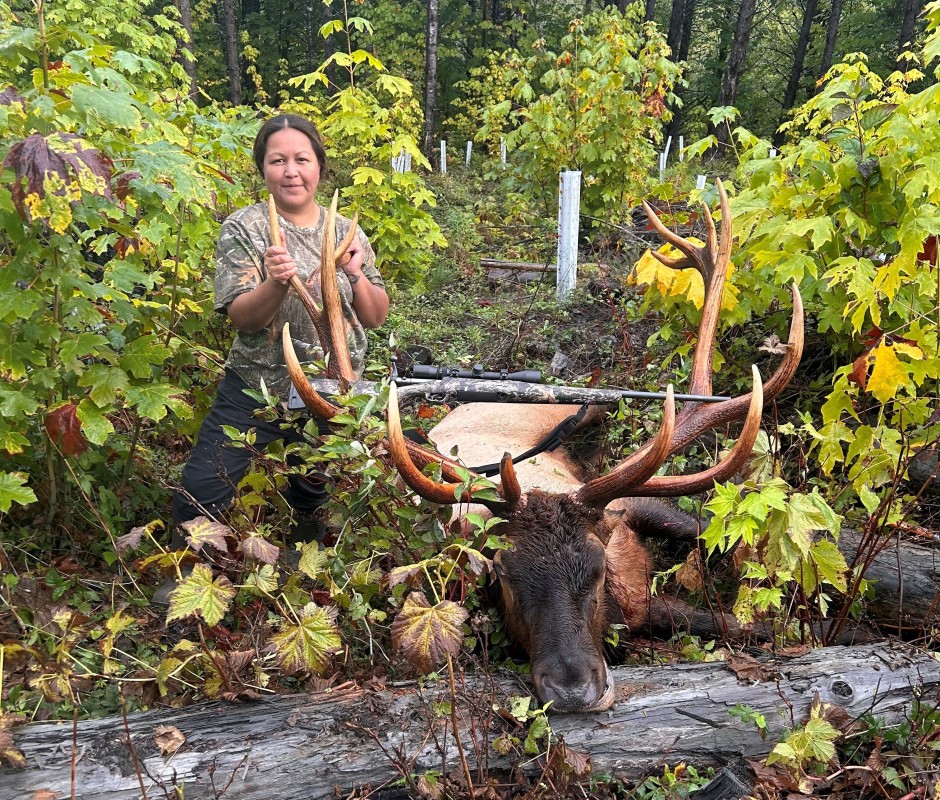 “When I harvest animals, I am always thanking the Creator. Being connected to our culture and our traditional prayer is always a meaningful way of grounding ourselves,” said Hassall, who was hunting with her husband John Morgan Hassall and brother Jordan Dick when she shot her first-ever elk.