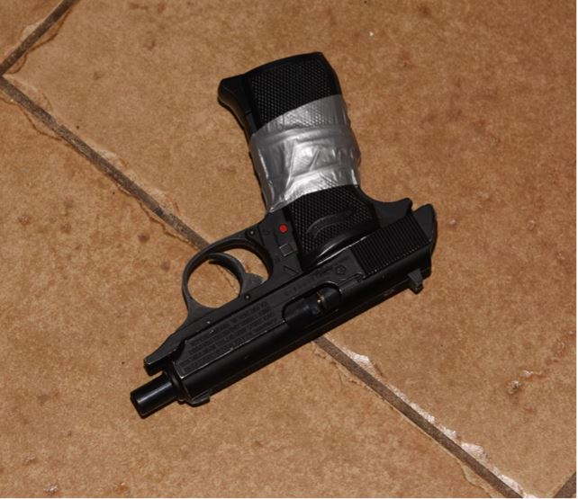 As he was in the back of the police car, the officers entered the residence, telling Martin that she was in breach of conditions from another conviction, including a stipulation that she not be in that community. Martin was in the bathroom “holding a realistic-looking replica handgun”, according to the report.