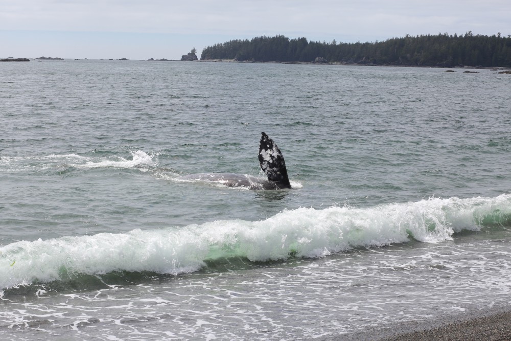 According to Paul Cottrell, a marine mammal coordinator with Fisheries and Oceans Canada (DFO), the whales found around Vancouver Island in April were floating offshore. At least three of the carcasses were towed ashore for necropsies. Two of the dead whales were towed to Nuu-chah-nulth territories, one in Huu-ay-aht territory and the other in Kyuquot.