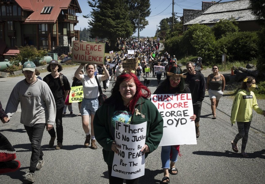 Protestors march the streets of Tofino in honour of Chantel Moore